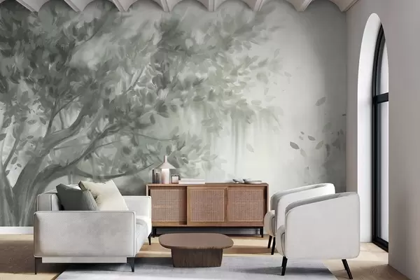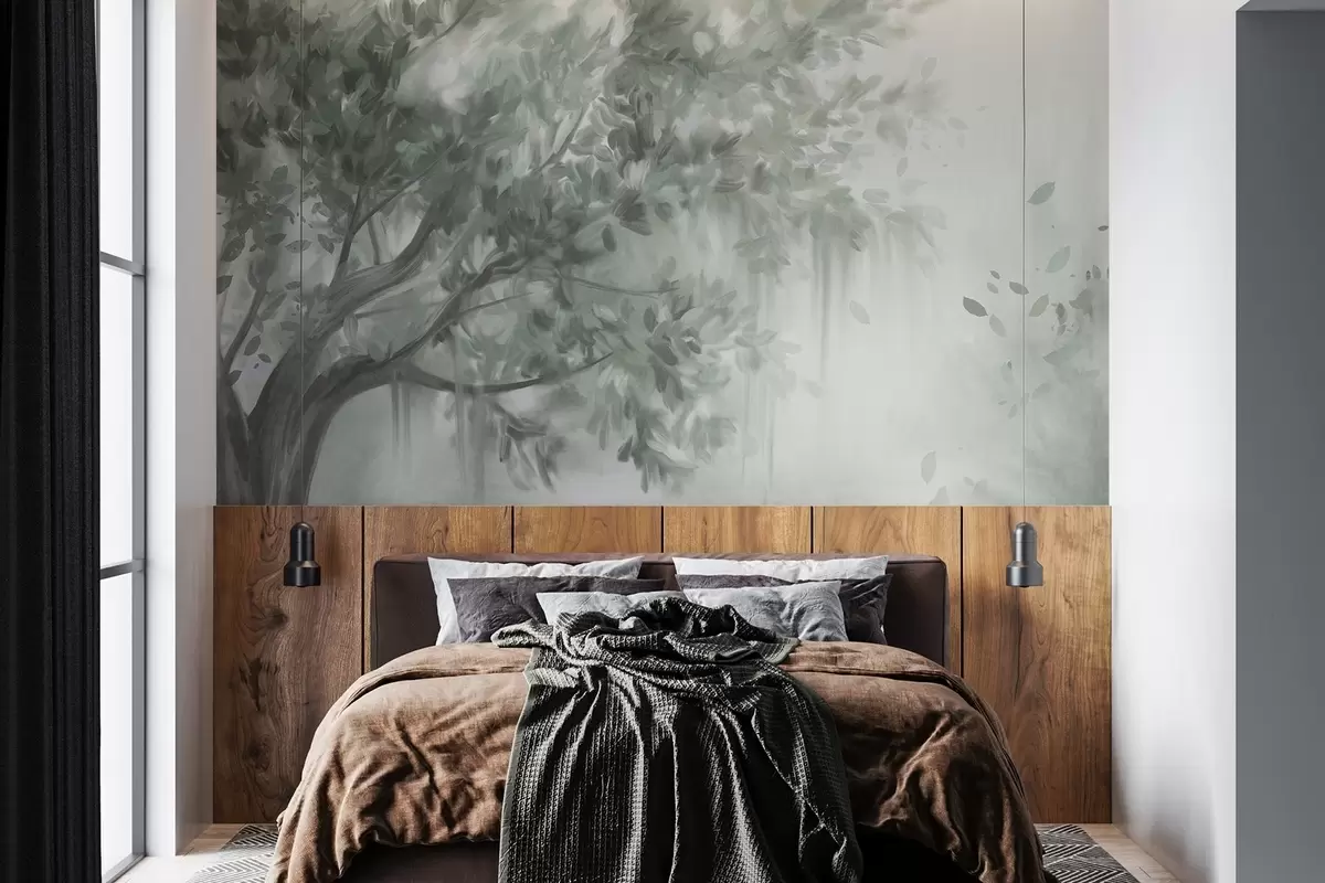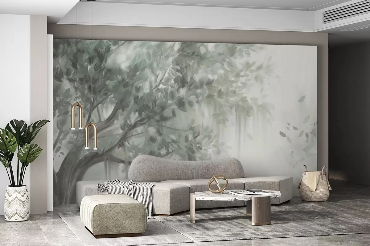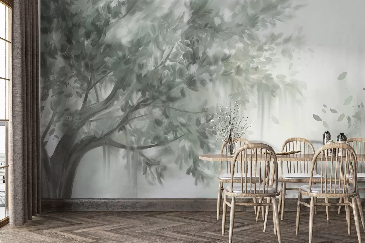 Valokuvatapetti Teksturoitu puu, jossa on vihreät lehdet ja oksat, pehmeällä, sumuisella taustalla Nr w09650v1