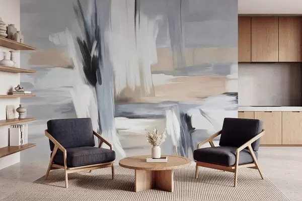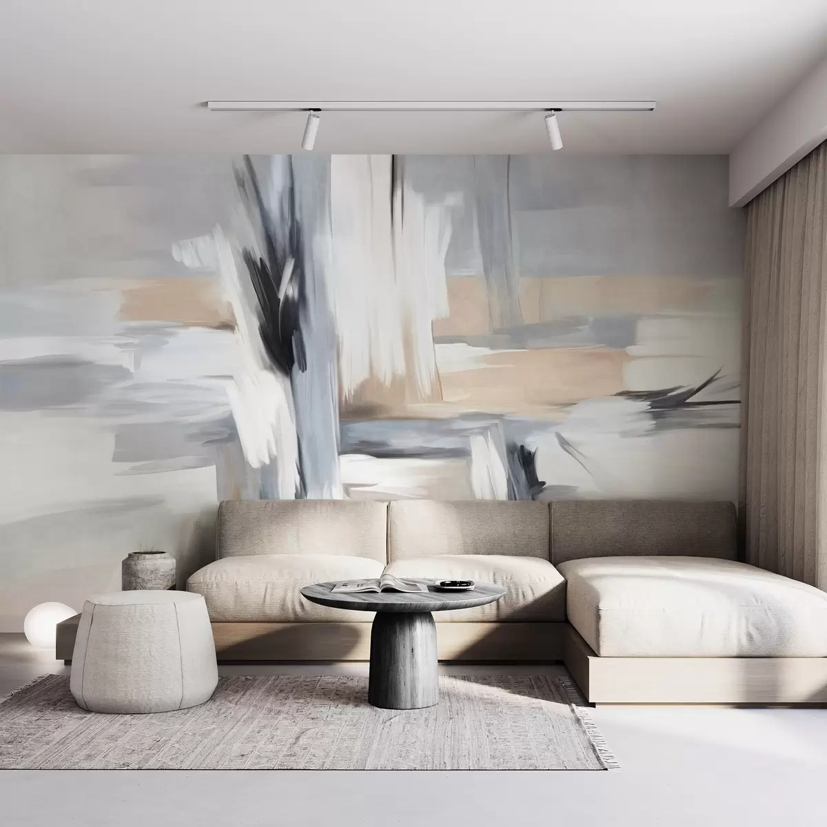 Valokuvatapetti Abstrakti teksturoitu maalaustekniikka, jossa on valkoisen, harmaan ja beigen sävyjä sisältäviä siveltimenvetoja. Nr w09651