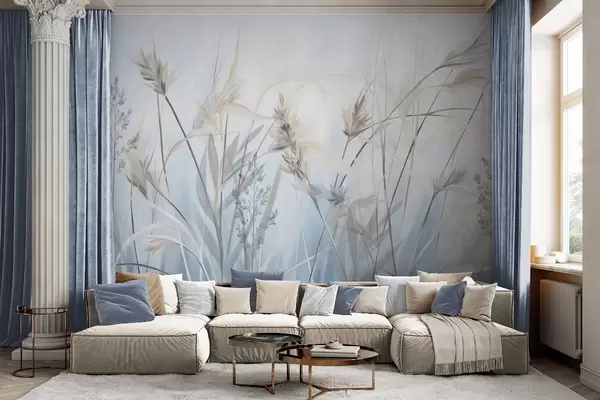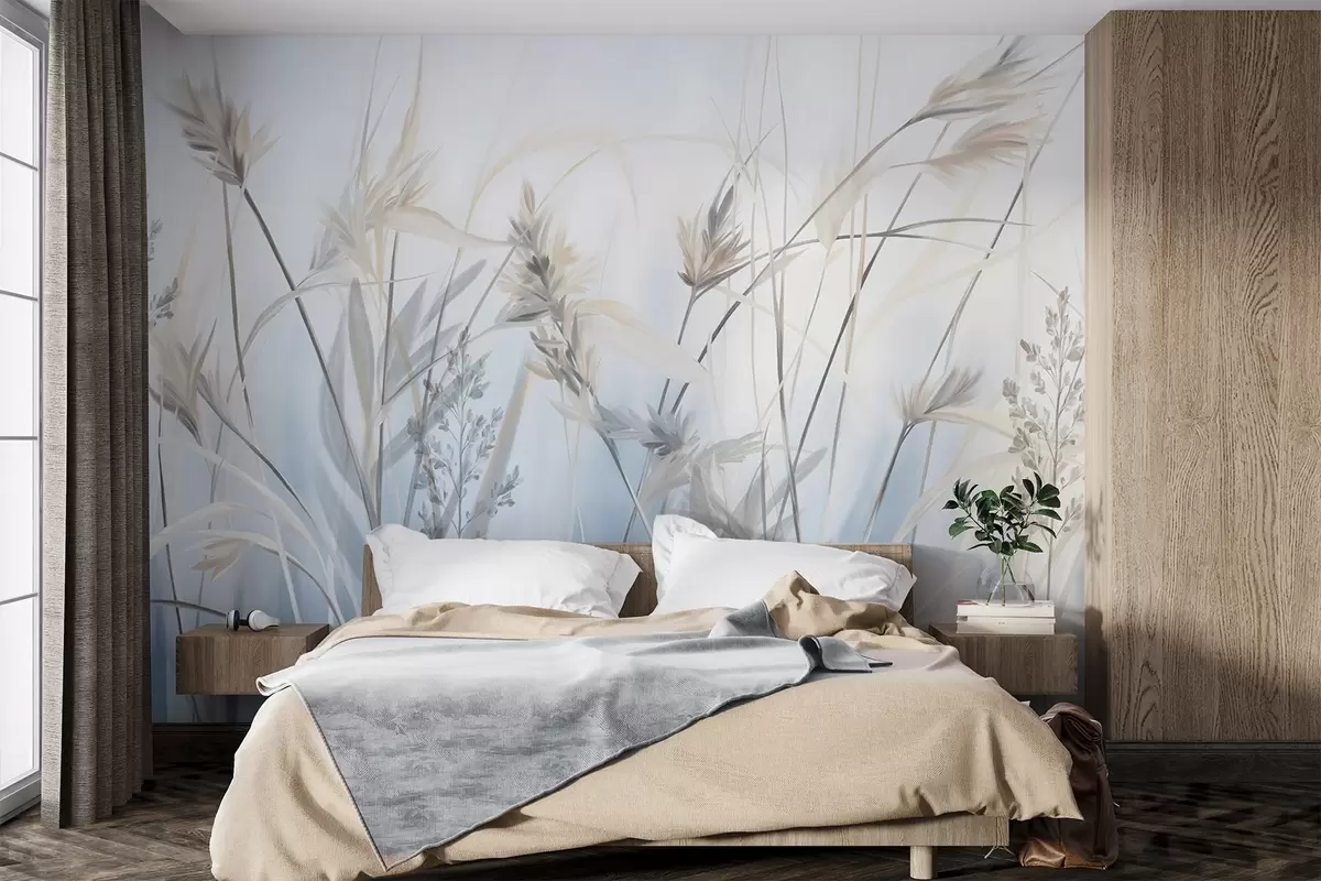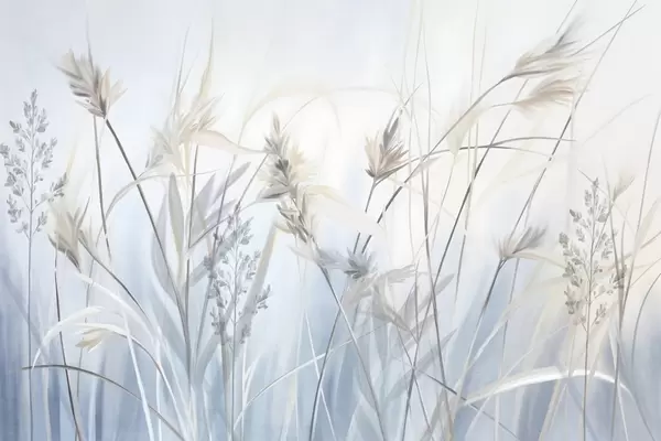 Valokuvatapetti Pitkät, kuivat ruohonvarret, joiden latvat ovat höyhenpeitteiset, hillityissä sävyissä, pehmeä, utuinen sininen ja valkoinen tausta Nr w09652