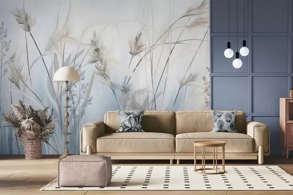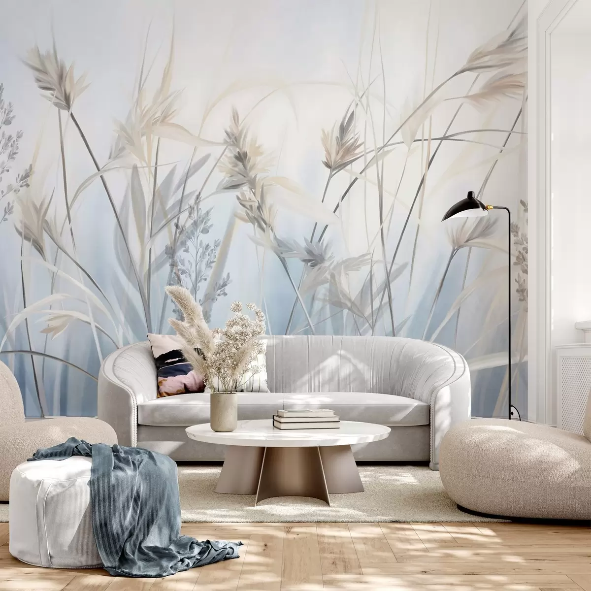 Valokuvatapetti Pitkät, kuivat ruohonvarret, joiden latvat ovat höyhenpeitteiset, hillityissä sävyissä, pehmeä, utuinen sininen ja valkoinen tausta Nr w09652