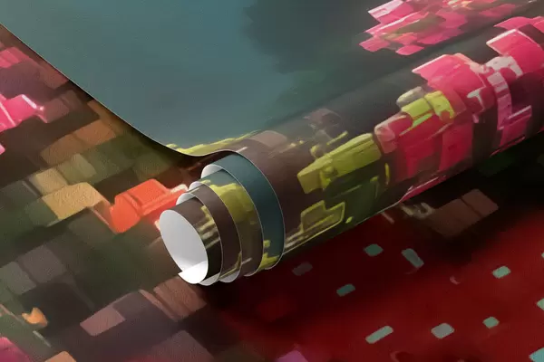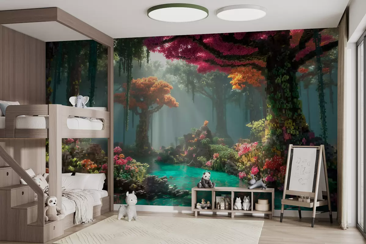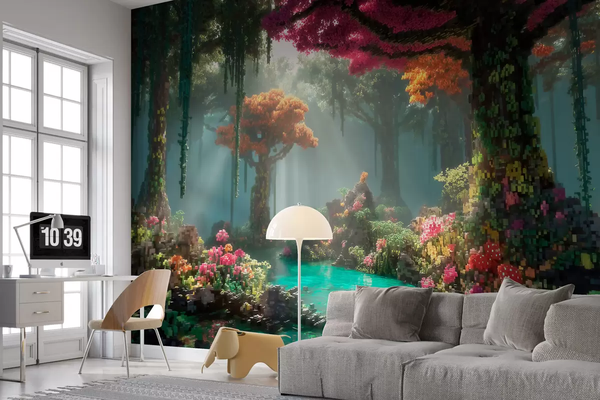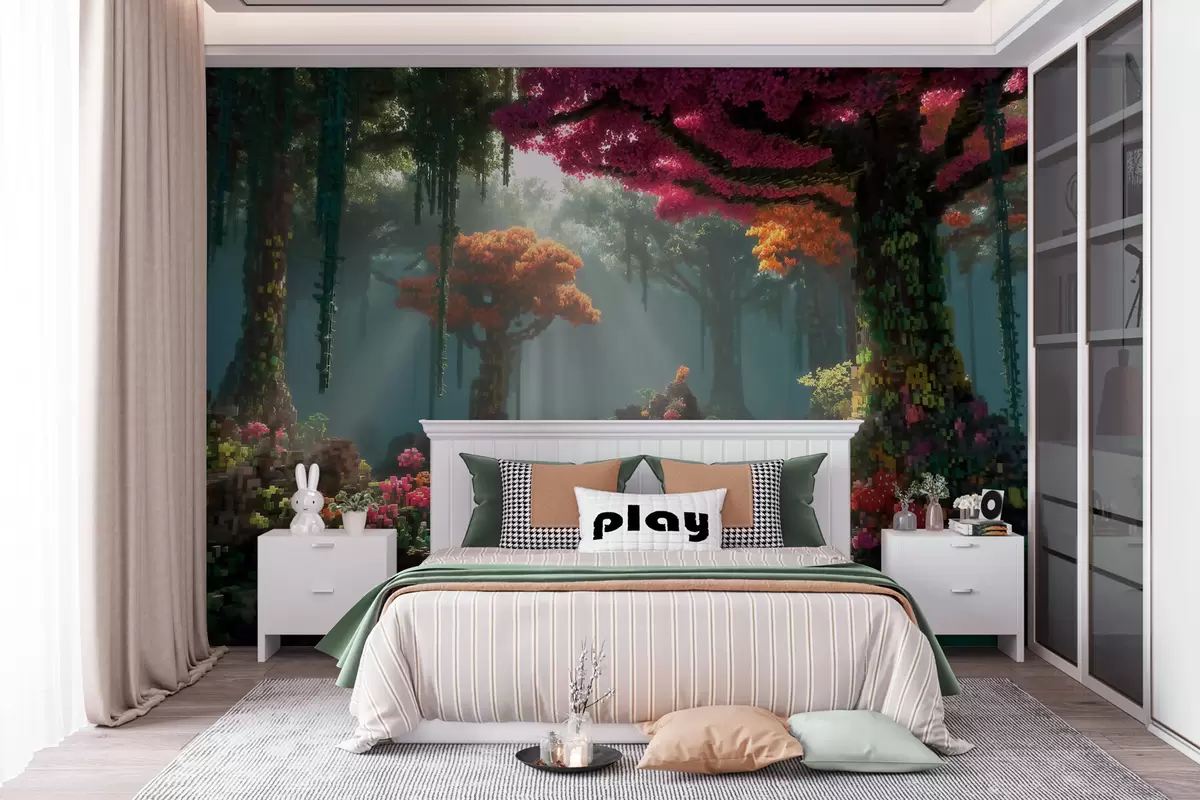 Valokuvatapetti Videopeleistä inspiraationsa saanut pikselimäinen lumottu metsä Nr w09683