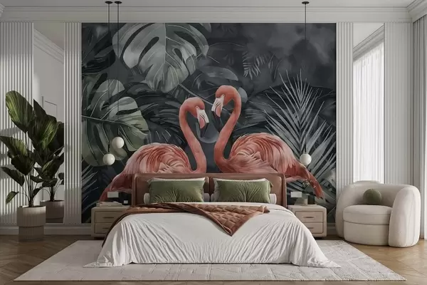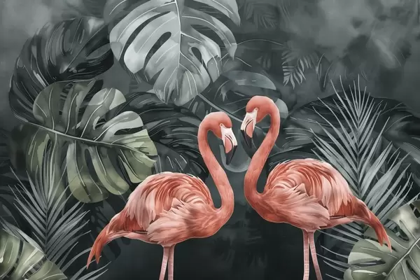 Valokuvatapetti Pari flamingoa trooppisissa kasveissa Nr w09687
