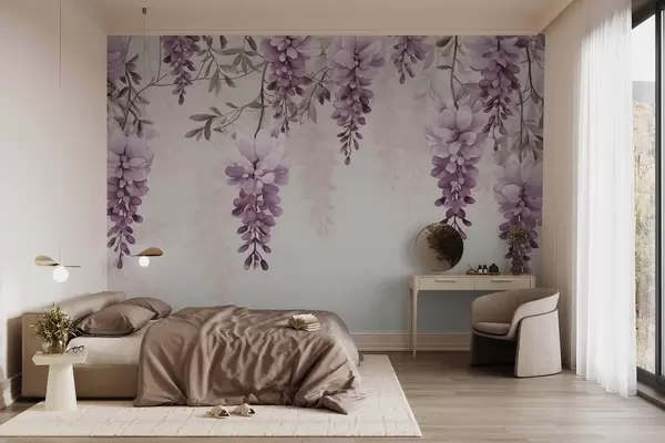 Valokuvatapetti Hienostuneet, suuret laventelin oksat seinällä, jäljitelmävesiväri Nr w09690