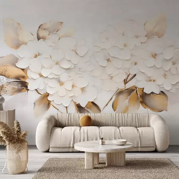 Valokuvatapetti Ylelliset hydrangeat keltaisilla lehdillä Nr w09711