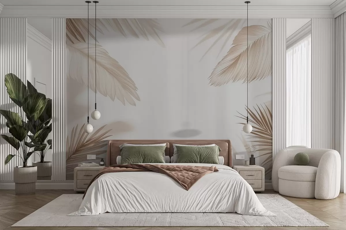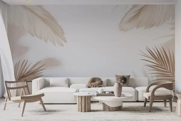 Valokuvatapetti Beige trooppinen sisustus, jossa on palmulehtien siluetteja ja pehmeitä varjoja Nr w09714