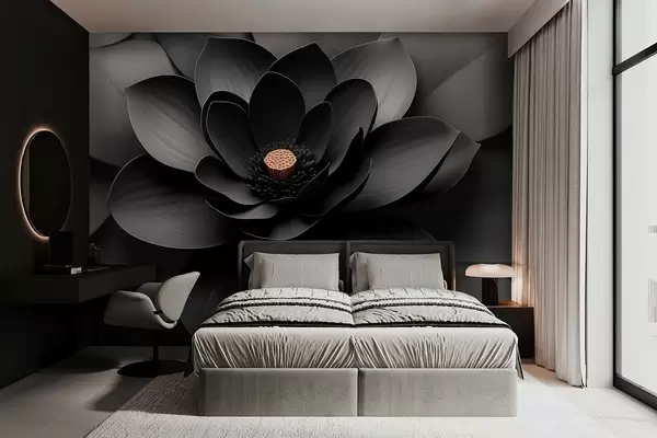 Valokuvatapetti Minimalistinen musta kukka, jossa on terälehtiä ja kontrastina lämmin keskusta Nr w09721