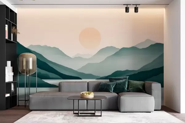 Valokuvatapetti Hiljainen vuoristomaisema, jossa aurinko paistaa järven yli Nr w09735