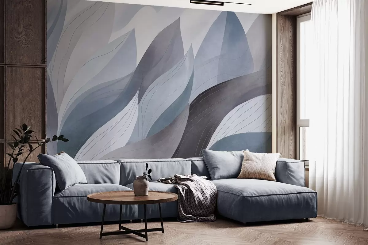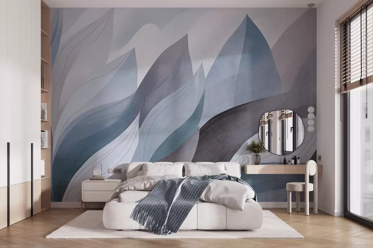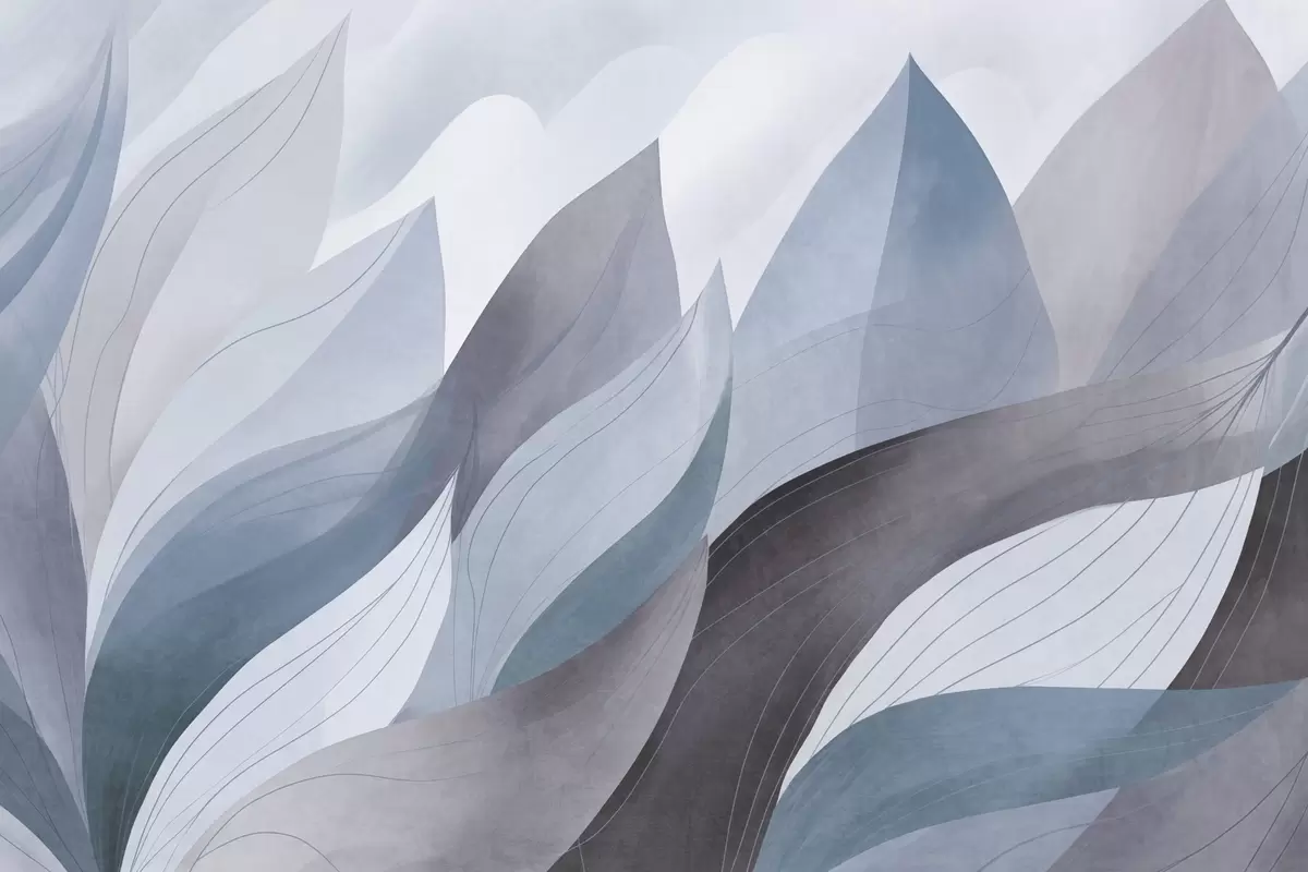 Valokuvatapetti Abstraktit lehdet, hillityt siniset maan sävyt ja herkät viivayksityiskohdat, pehmeä vesiväri-tekstuuri Nr w09736v1