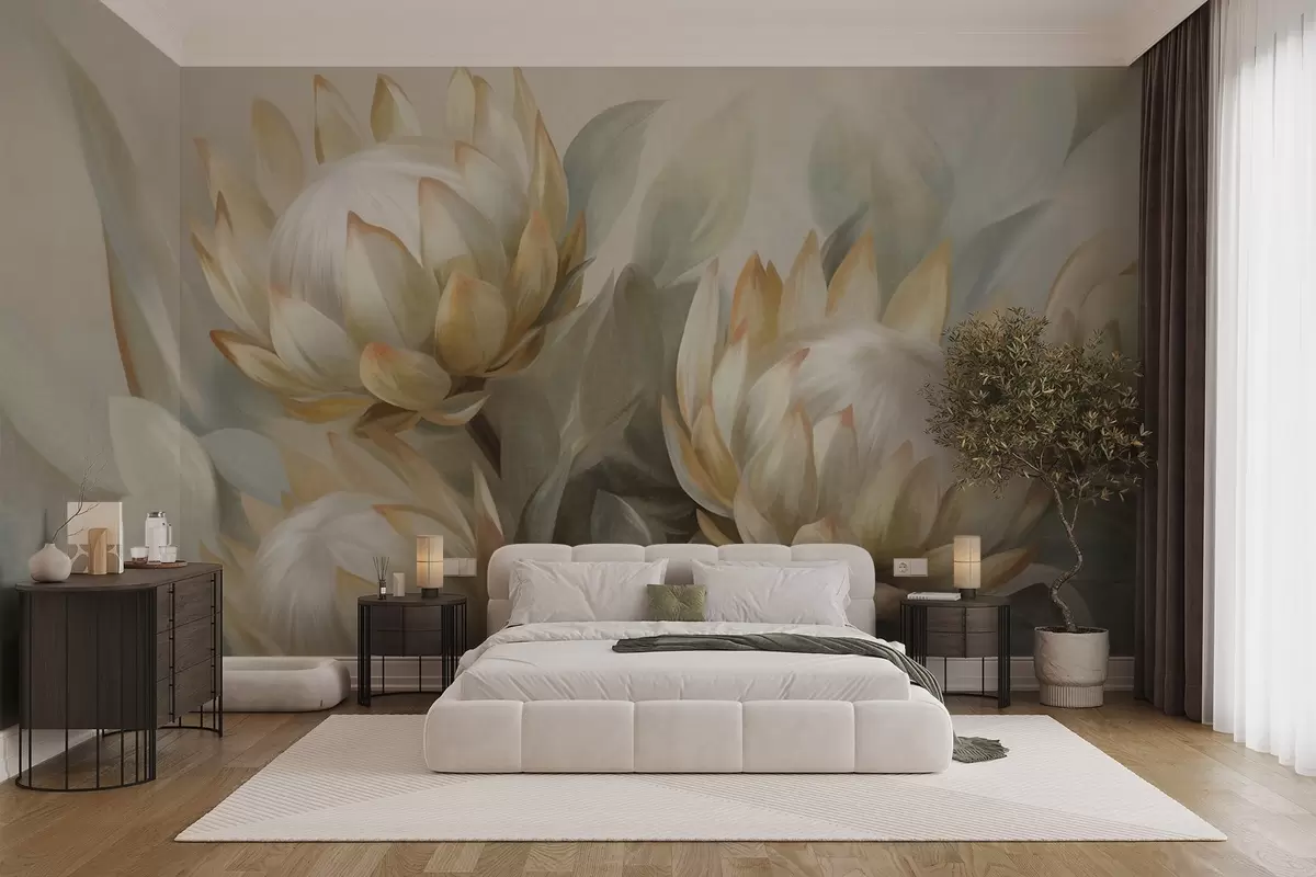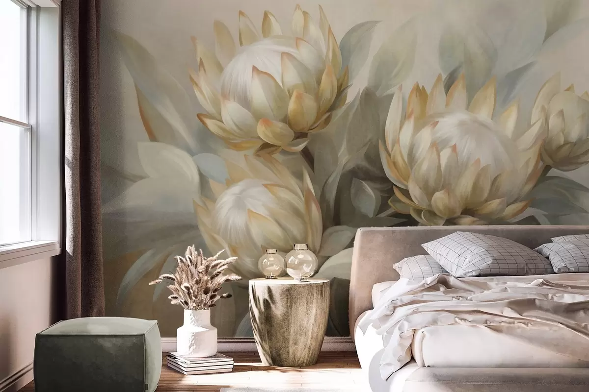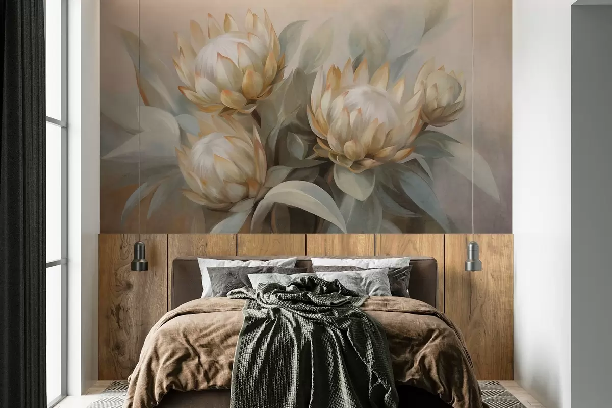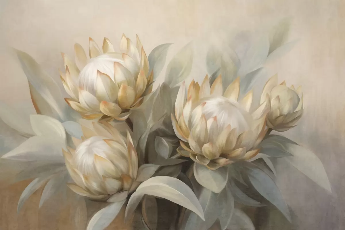 Valokuvatapetti Teksturoidut proteakukat vihreillä lehdillä ja pehmeällä, hämärtyneellä taustalla Nr w09738