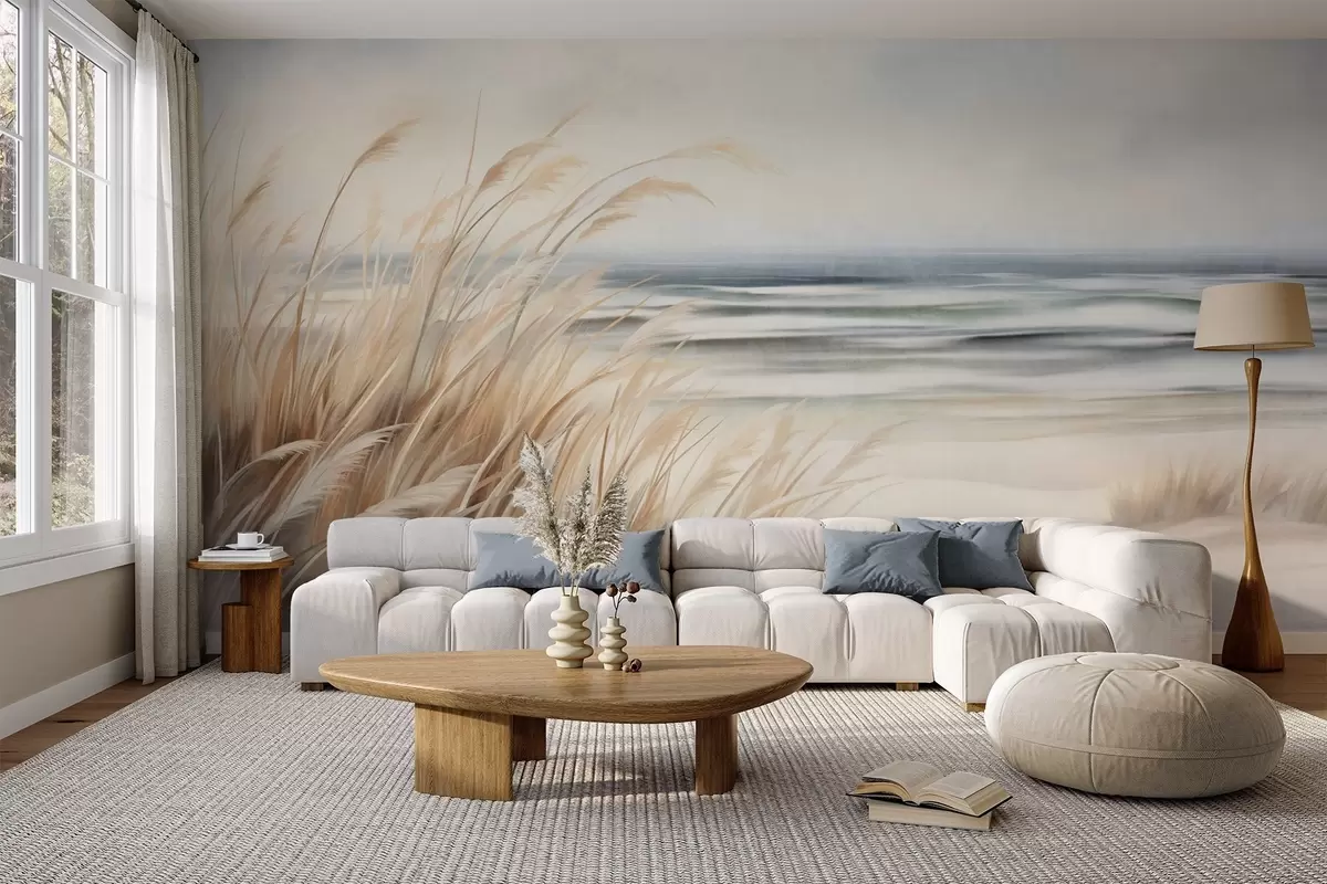 Valokuvatapetti Teksturoitu maisema, jossa on kuivaa ruohoa hiekkarannalla, taustalla meri ja taivas Nr w09739