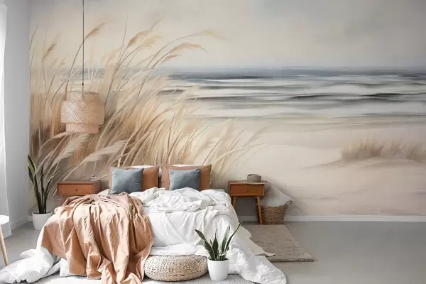 Valokuvatapetti Teksturoitu maisema, jossa on kuivaa ruohoa hiekkarannalla, taustalla meri ja taivas Nr w09739