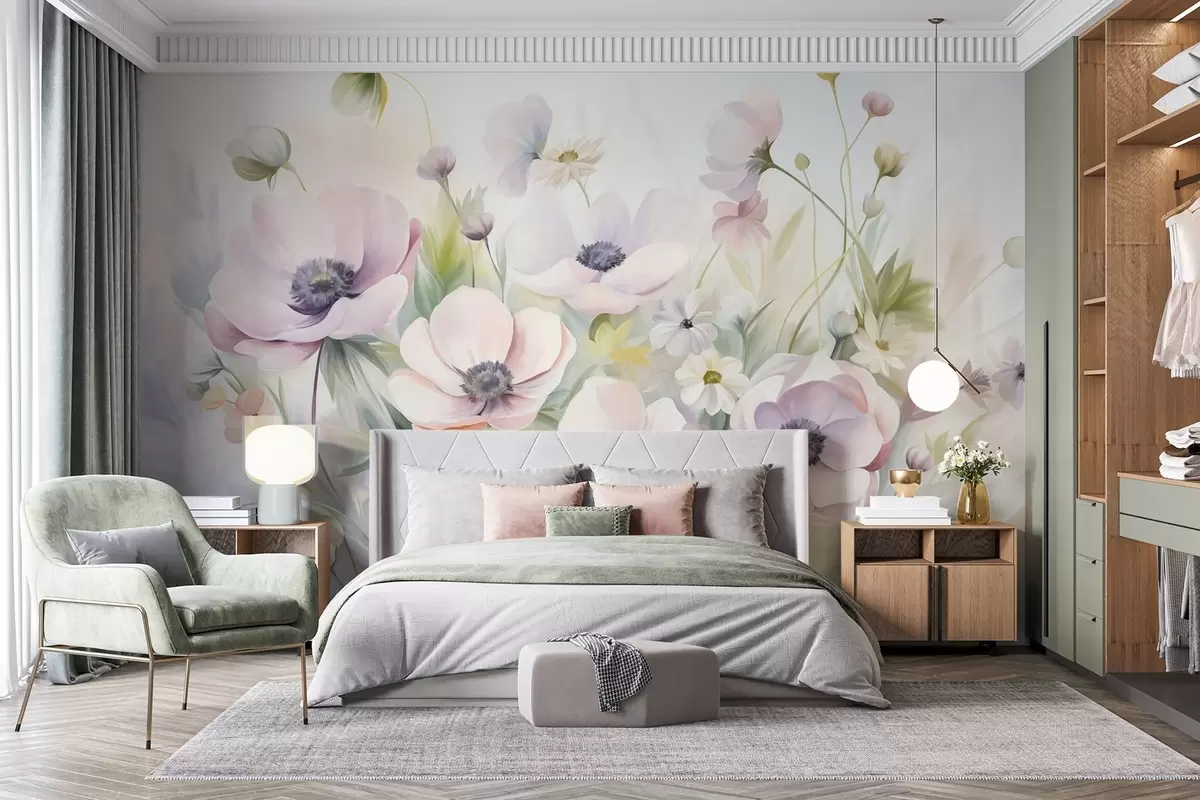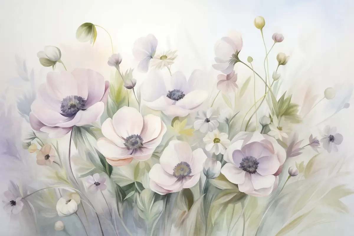 Valokuvatapetti Pastellinpunaisia ja valkoisia anemone-kukkia, vihreää lehtien ja pieniä valkoisia koiranputkia Nr w09742