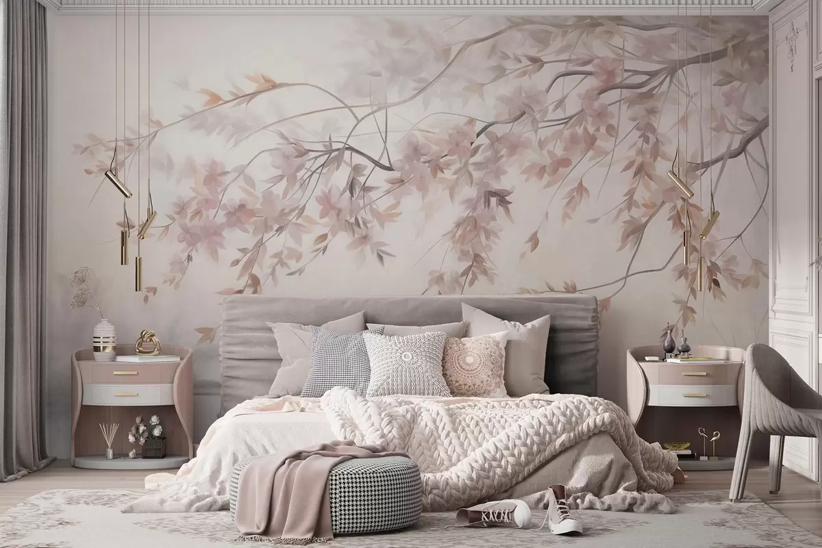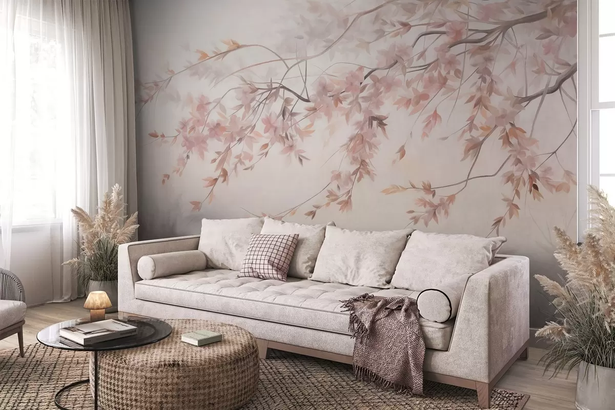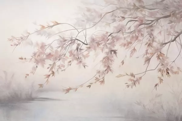 Valokuvatapetti Teksturoitu maisema, jossa on kirsikankukkaoksat, vaaleanpunaiset lehdet ja pehmeä, sumuinen tausta Nr w09743