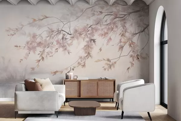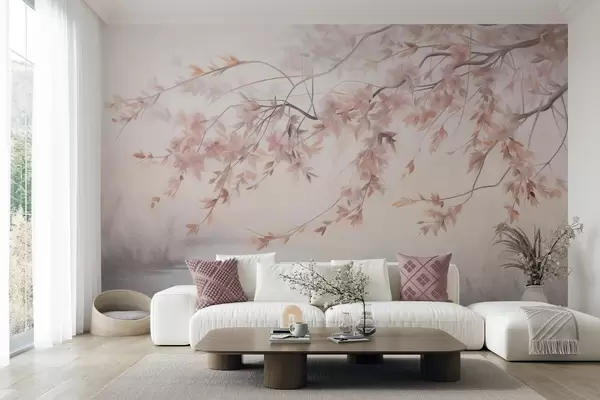 Valokuvatapetti Teksturoitu maisema, jossa on kirsikankukkaoksat, vaaleanpunaiset lehdet ja pehmeä, sumuinen tausta Nr w09743
