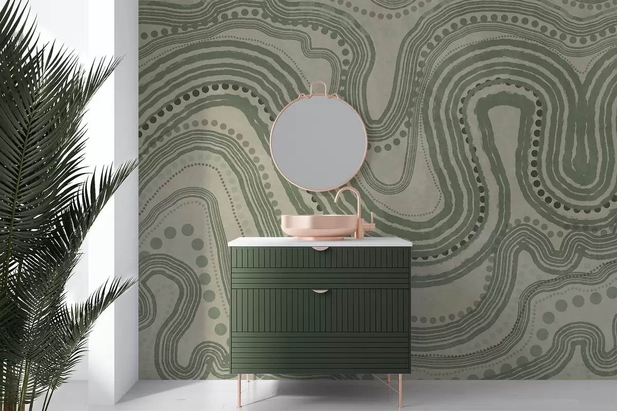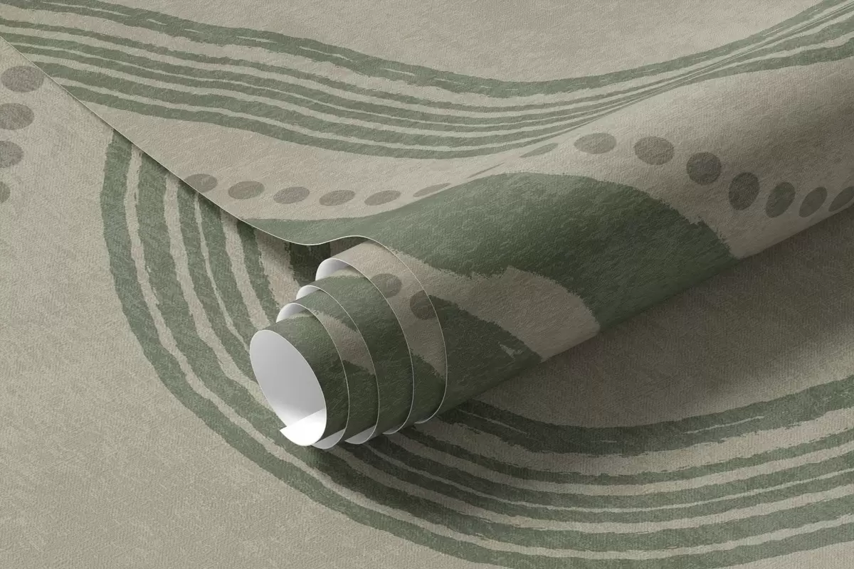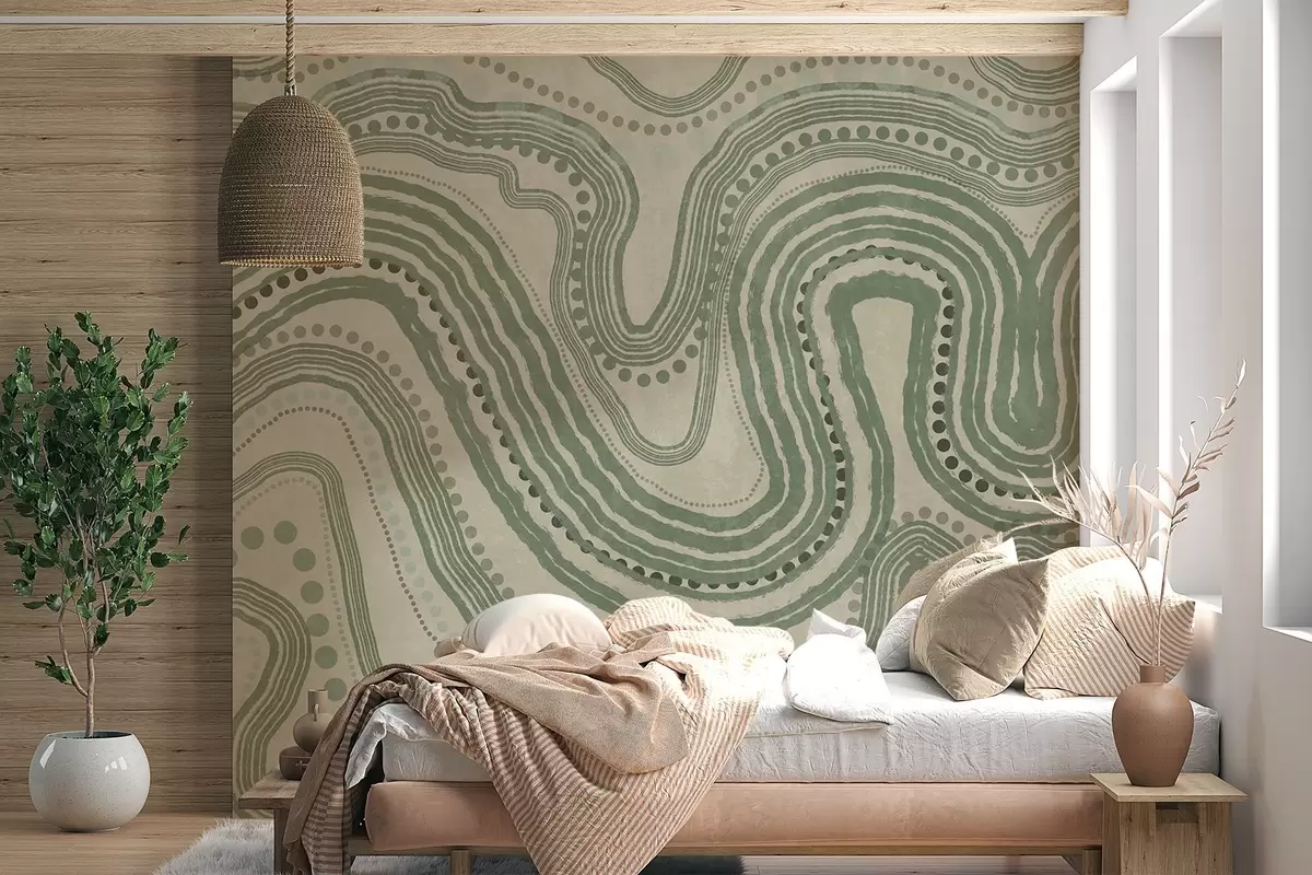 Valokuvatapetti Abstraktit vihreät ja beige aaltoilevat viivat ja pisteet, moderni teksturoitu taide Nr w09747