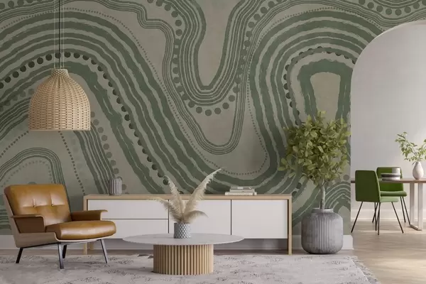 Valokuvatapetti Abstraktit vihreät ja beige aaltoilevat viivat ja pisteet, moderni teksturoitu taide Nr w09747