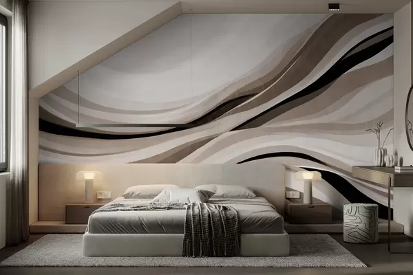 Valokuvatapetti Abstraktit aaltoilevat viivat beige- ja mustan sävyissä vaaleaa taustaa vasten, teksturoitu taide Nr w09748