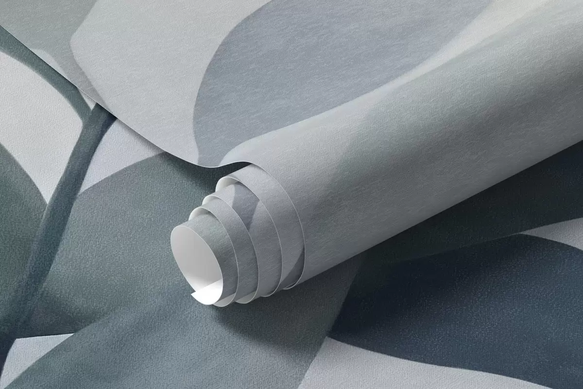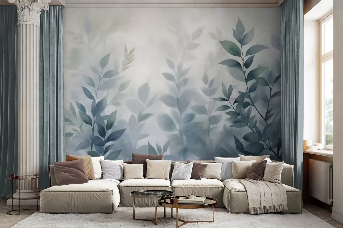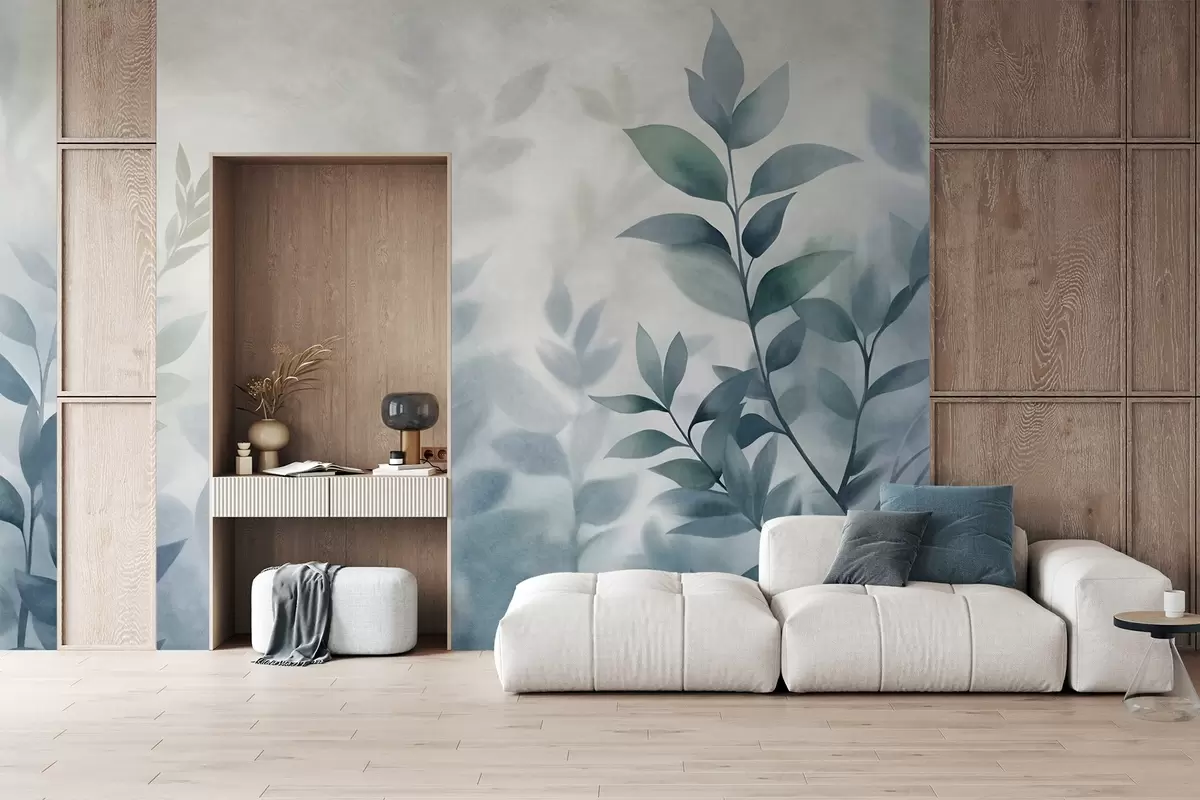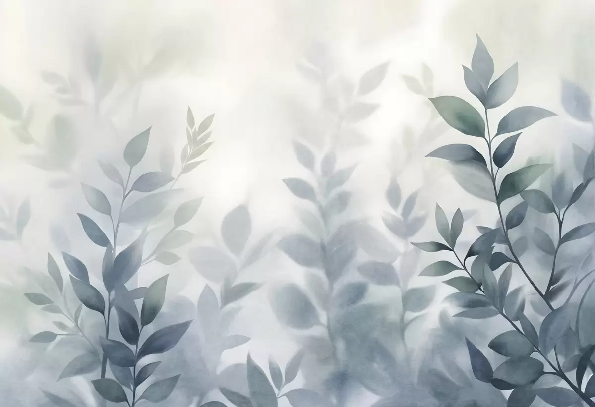 Valokuvatapetti Hienostuneet oksat hillityn sinisillä lehdillä, akvarellityylinen maalaus, teksturoitu taide Nr w09750v1