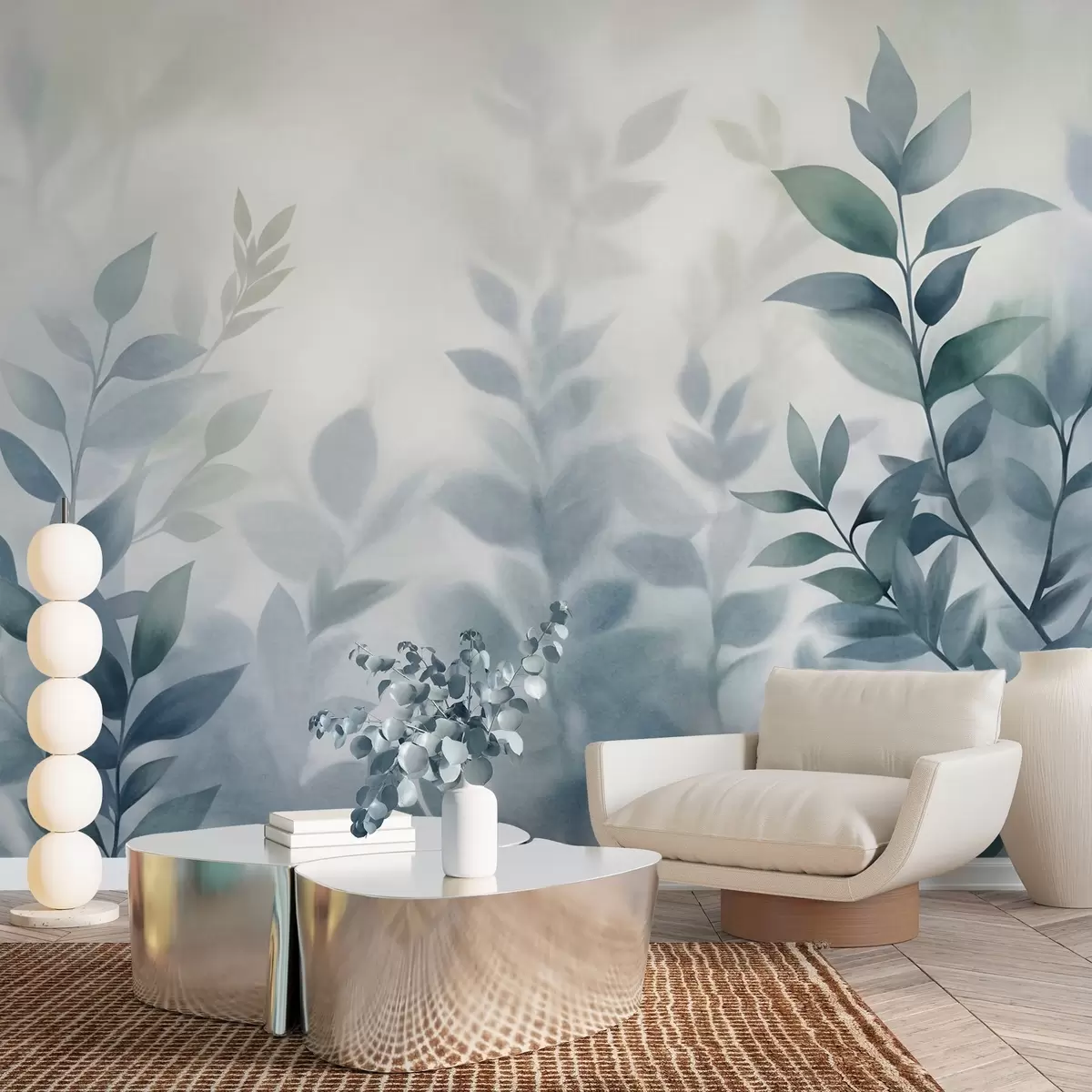 Valokuvatapetti Hienostuneet oksat hillityn sinisillä lehdillä, akvarellityylinen maalaus, teksturoitu taide Nr w09750v1