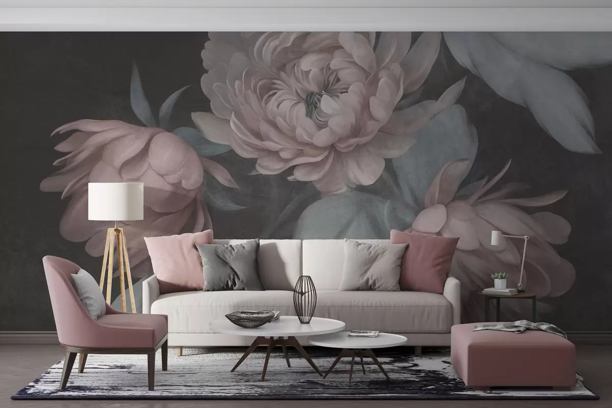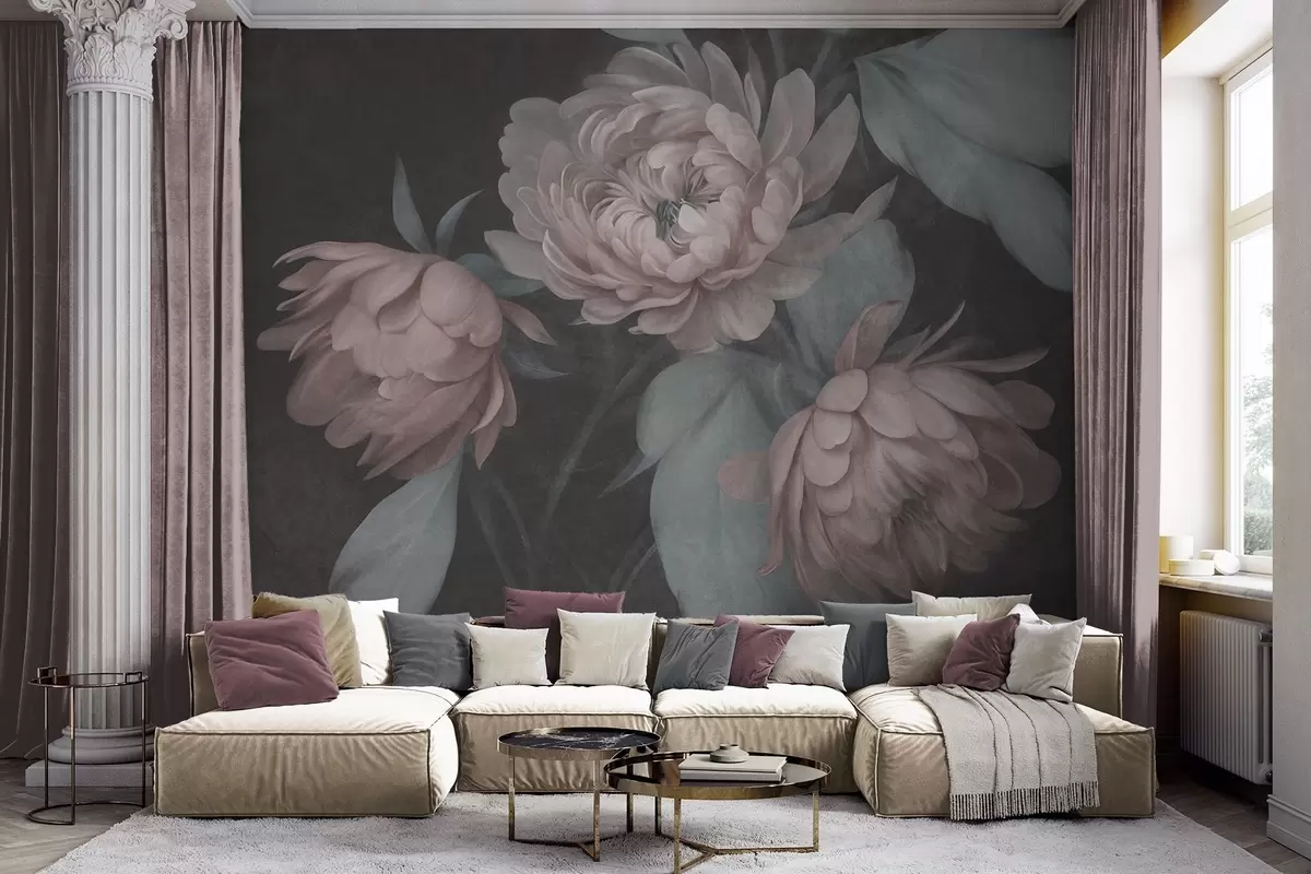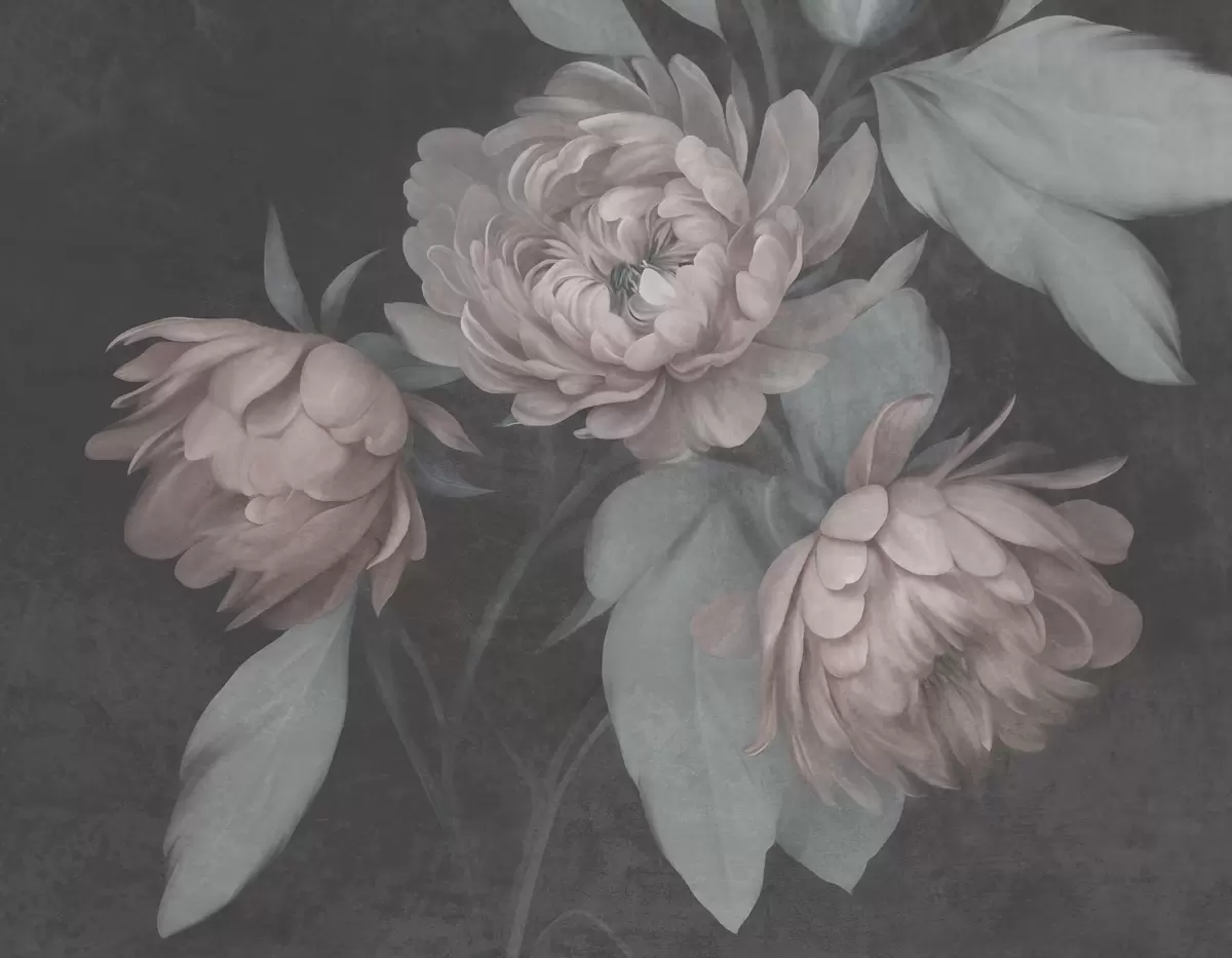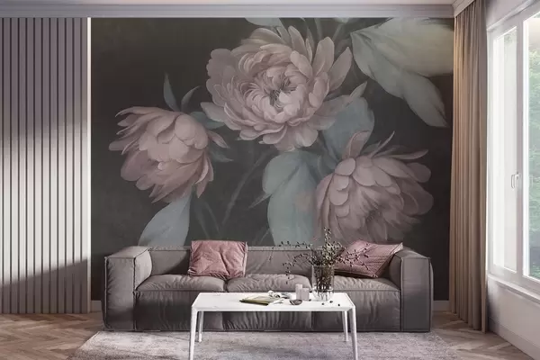 Valokuvatapetti Teksturoidut vaaleanpunaiset pionikukat ja hillityn vihreät lehdet tummaa taustaa vasten Nr w09751v1