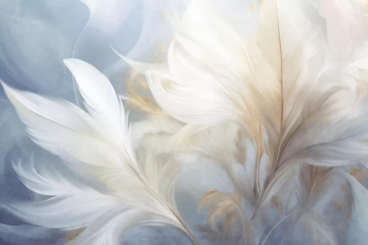 Valokuvatapetti Teksturoidut pehmeät, valkoiset höyhenet ja hämärtynyt pampasruoho sinisellä ja valkoisella taustalla Nr w09758