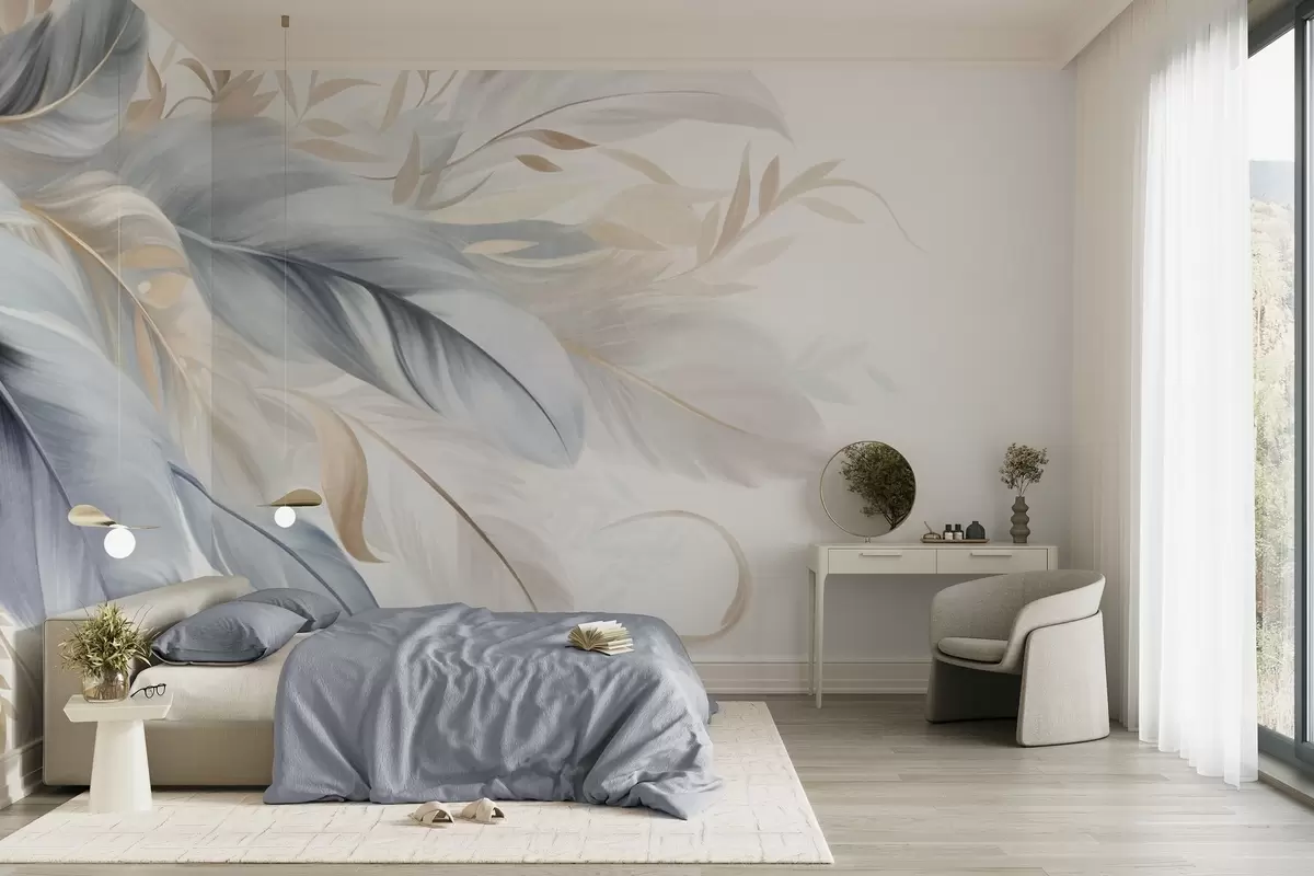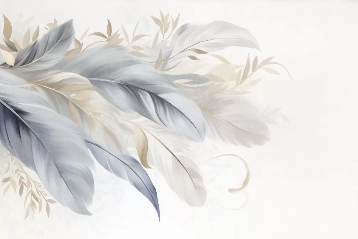 Valokuvatapetti Teksturoidut pastellisävyiset höyhenet ja herkät lehdet vaalealla taustalla Nr w09763
