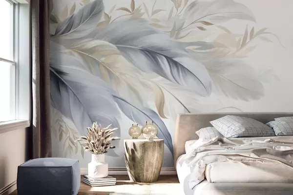 Valokuvatapetti Teksturoidut pastellisävyiset höyhenet ja herkät lehdet vaalealla taustalla Nr w09763