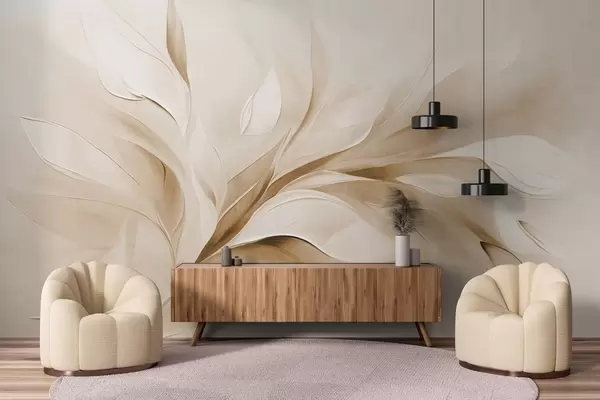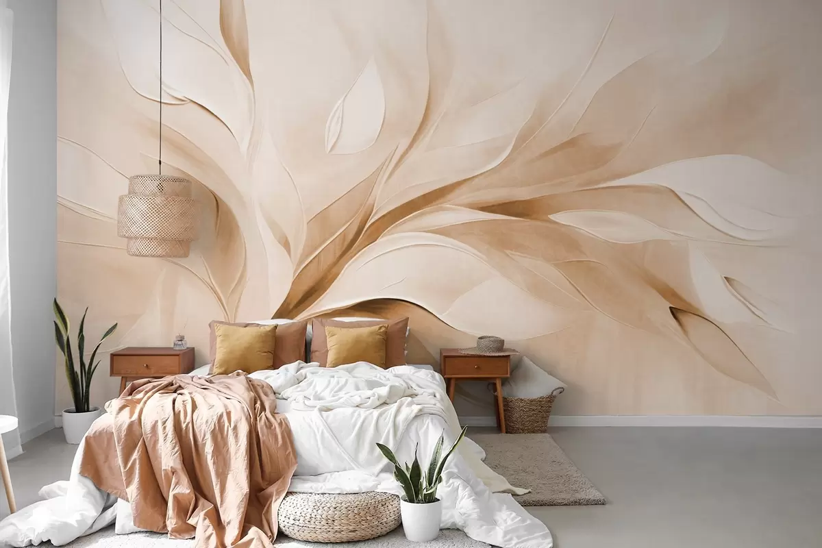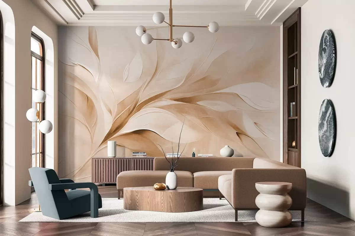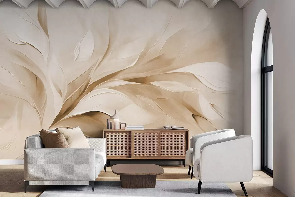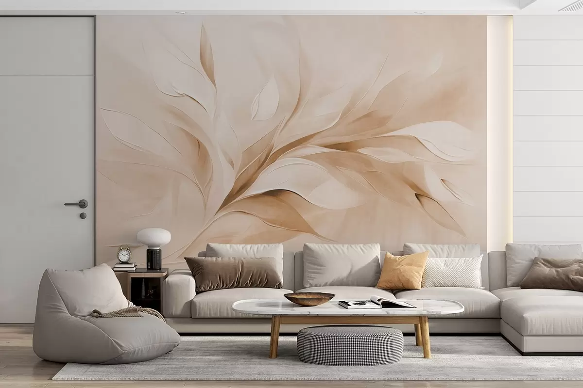 Valokuvatapetti Abstrakti, teksturoitu maalaus tyylillä, jossa beige ja valkoiset lehdet virtaavat Nr w09765v1