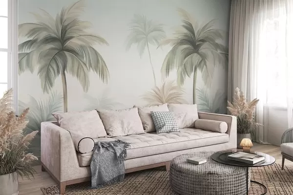 Valokuvatapetti Kämmenmuotoiset puut, joiden hillityn vihreät ja beigeä sävyt saavat vastapainoa pehmeän taivaan taustalla Nr w09770