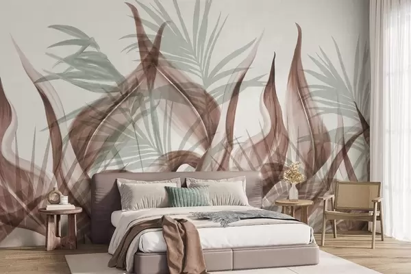 Valokuvatapetti Ruskean ja vihreän sävyiset trooppiset lehdet valkoisella taustalla, teksturoitu vesivärityyli Nr w09772