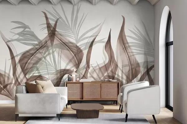 Valokuvatapetti Ruskean ja vihreän sävyiset trooppiset lehdet valkoisella taustalla, teksturoitu vesivärityyli Nr w09772