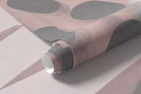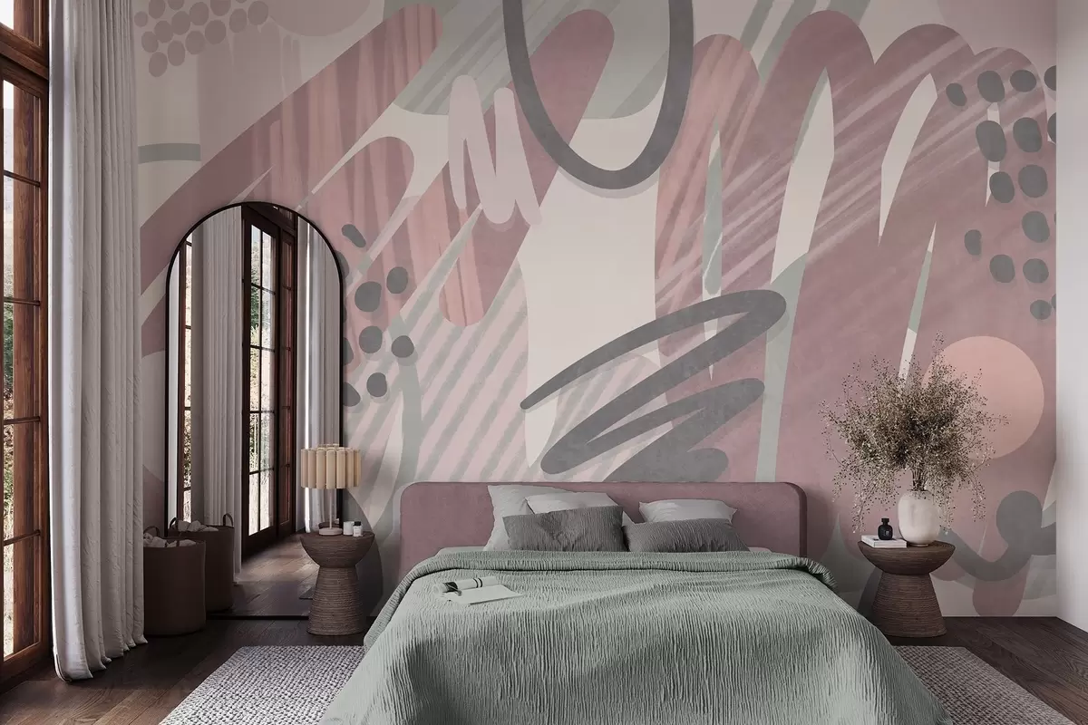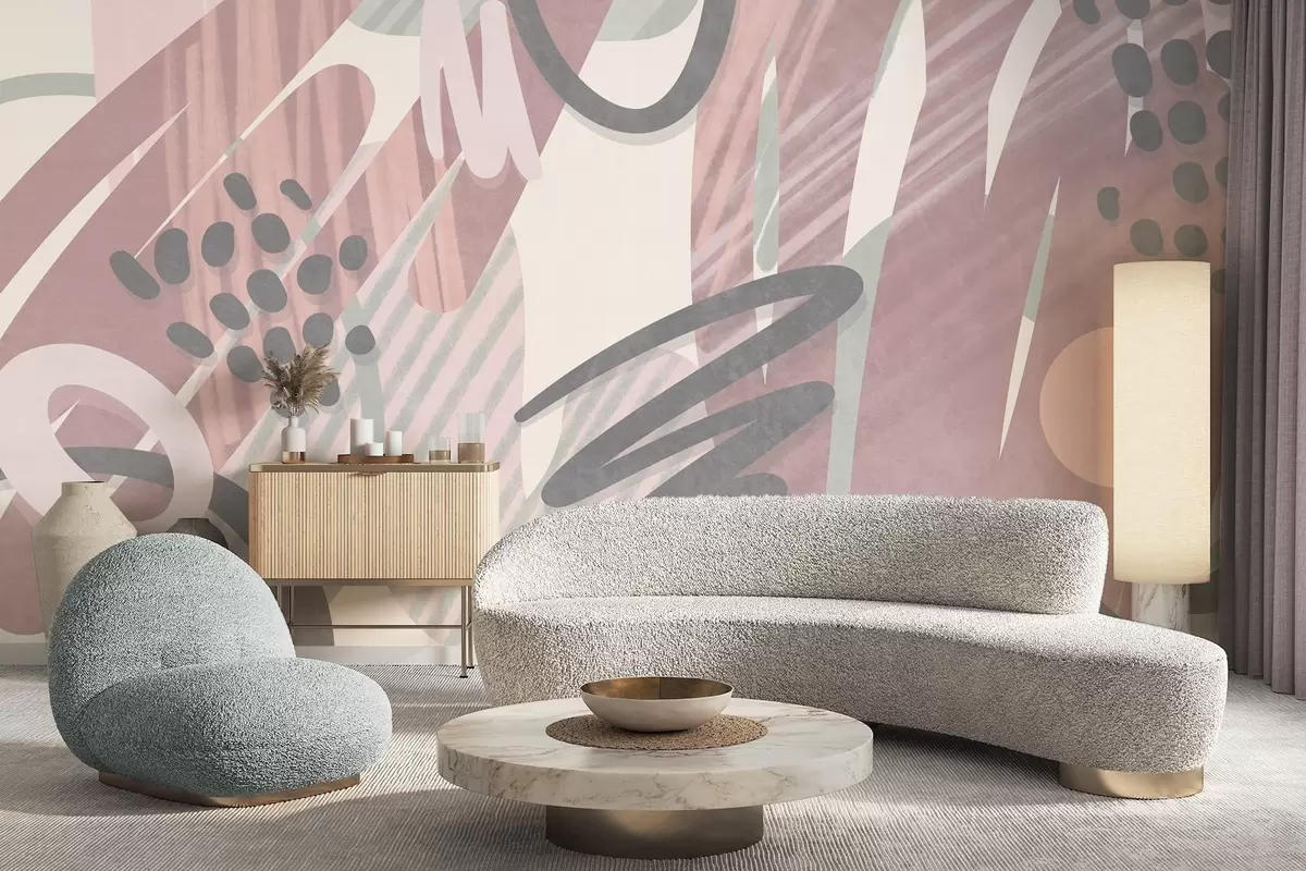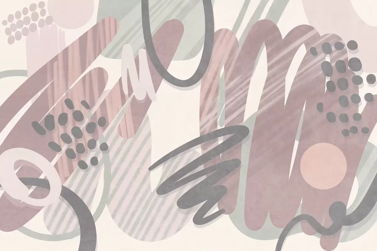 Valokuvatapetti Abstrakti kuvioitu kuosi, jossa on orgaanisia muotoja, raapustuksia ja pisteitä hillityissä pastellisävyissä Nr w09774v1