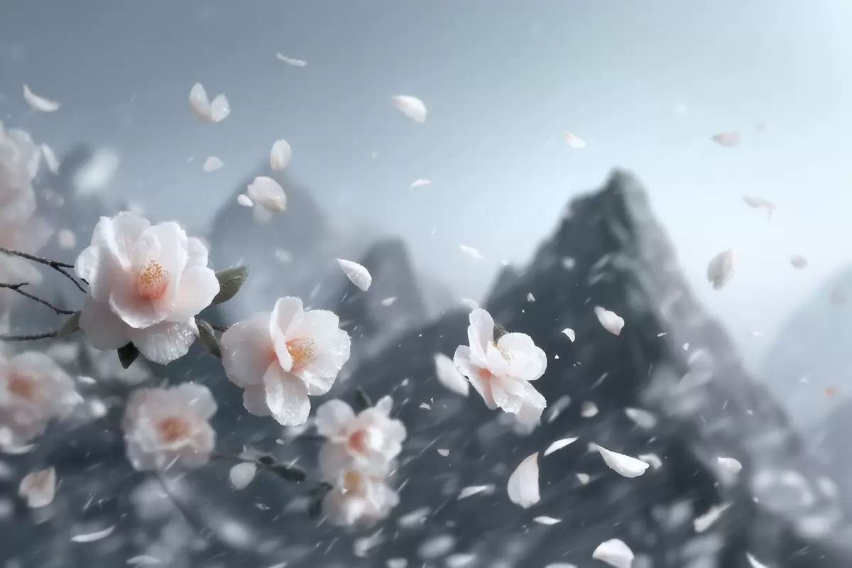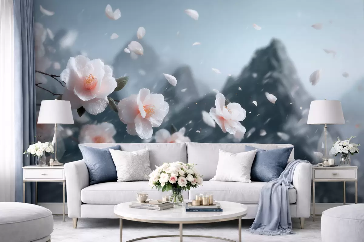 Valokuvatapetti Hienostuneet kirsikankukat vuorten taustalla, tunnelmallinen japanilainen maisema pastellisävyissä Nr w09808
