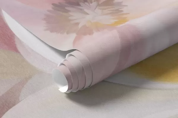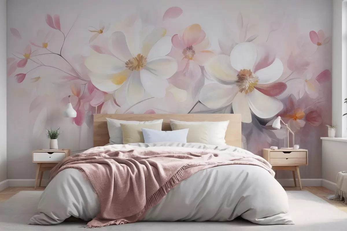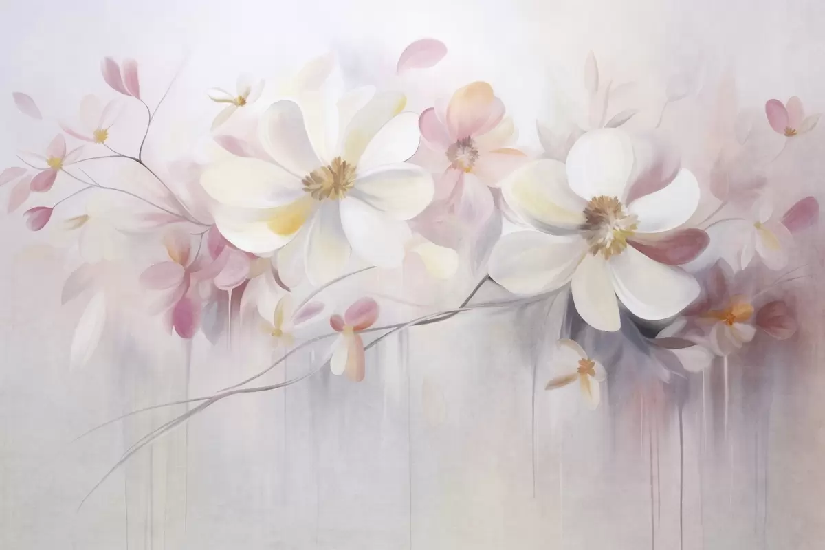 Valokuvatapetti Valkoisia ja vaaleanpunaisia kukkia, joiden herkät terälehdet on kuvattu teksturoidulla, abstraktilla ja pehmeällä taustalla Nr w09811