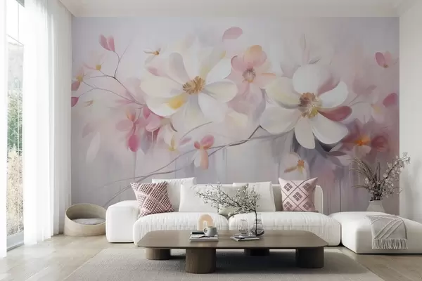 Valokuvatapetti Valkoisia ja vaaleanpunaisia kukkia, joiden herkät terälehdet on kuvattu teksturoidulla, abstraktilla ja pehmeällä taustalla Nr w09811
