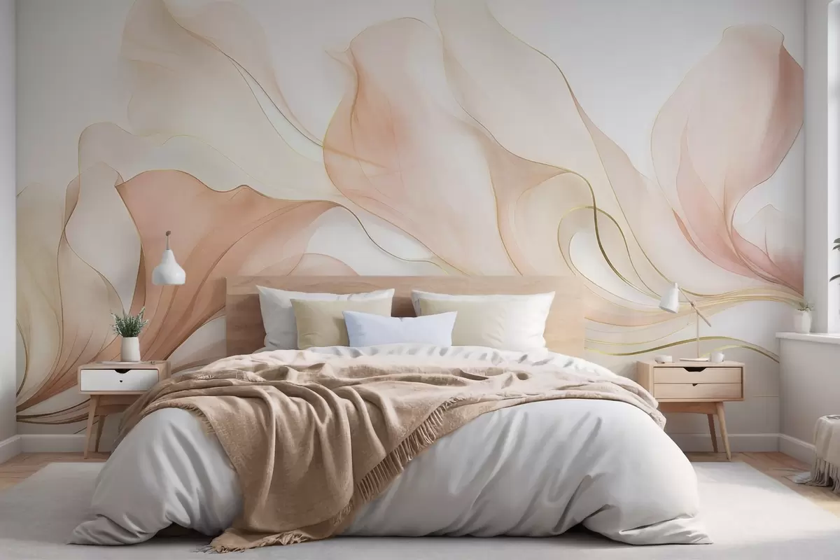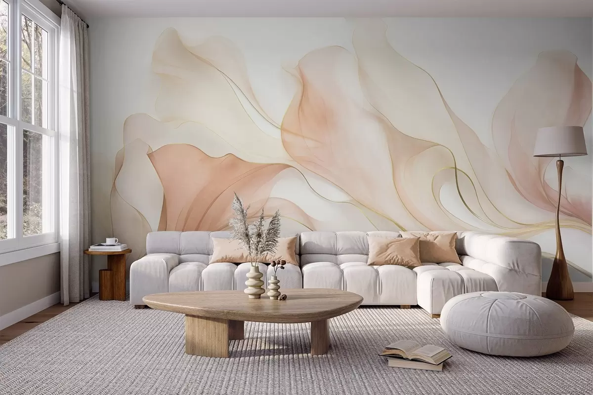 Valokuvatapetti Abstrakti, virtaava tekstuuri persikan ja kerman sävyissä, hienoilla viivoilla Nr w09815