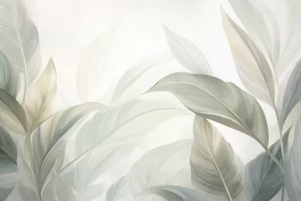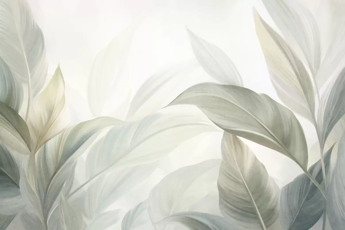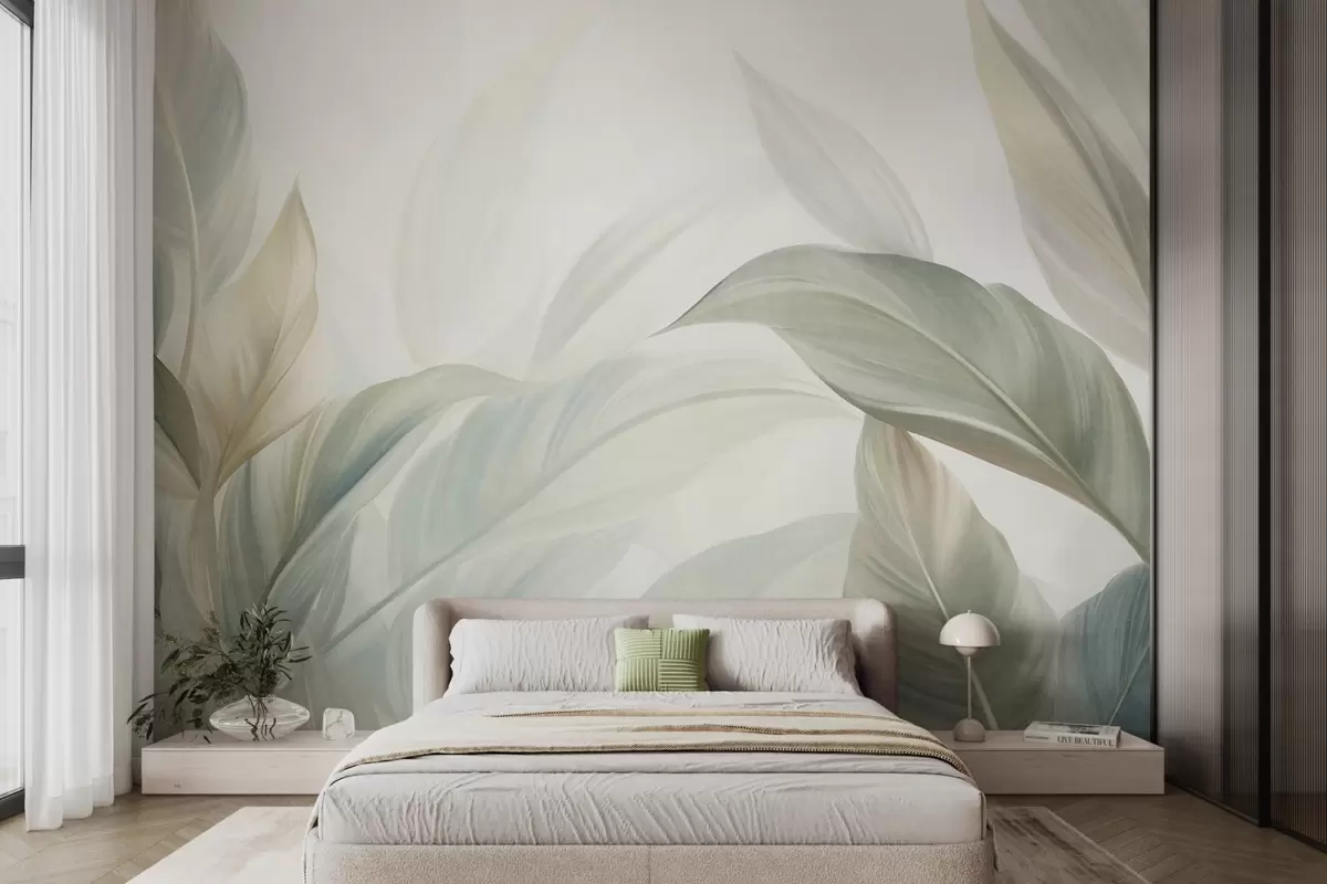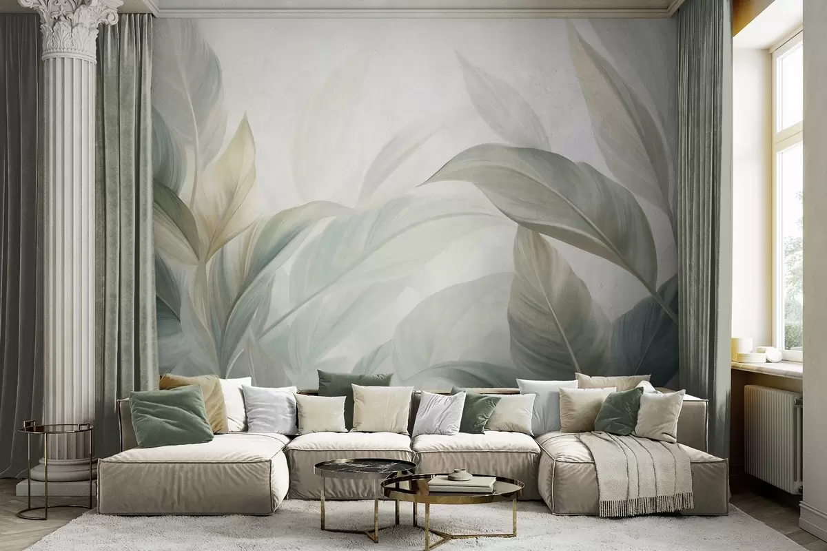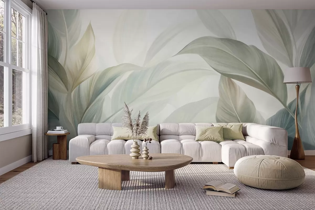 Valokuvatapetti Suuret, vaaleanvihreät trooppiset lehdet, joissa on pehmeitä pastellisävyjä ja teksturoituja kuvioita Nr w09816