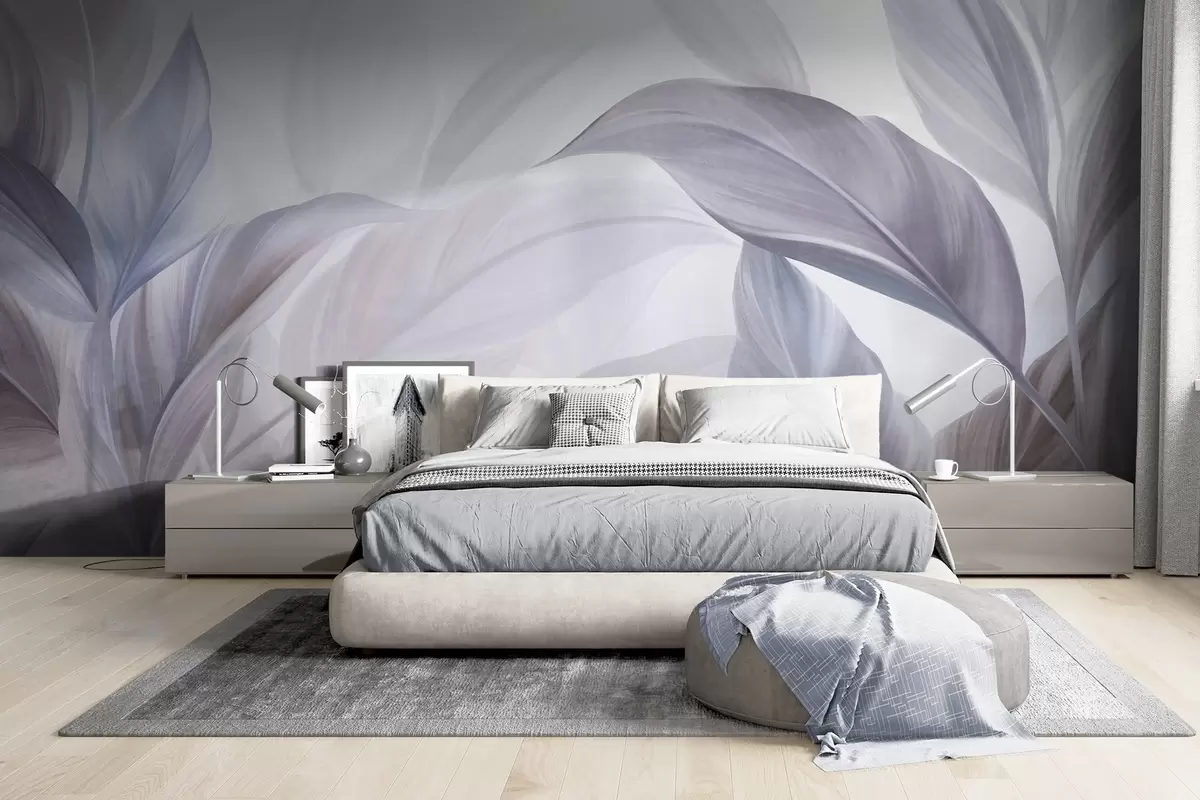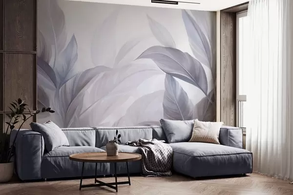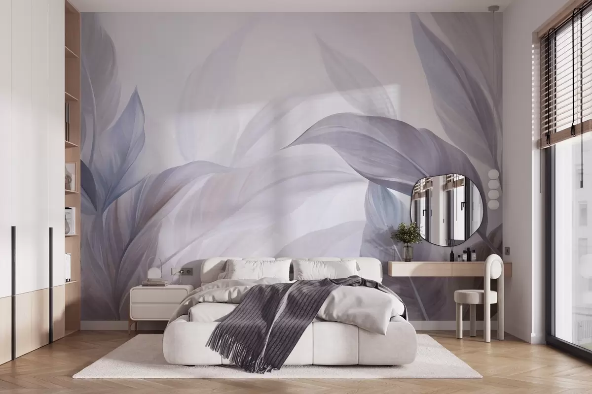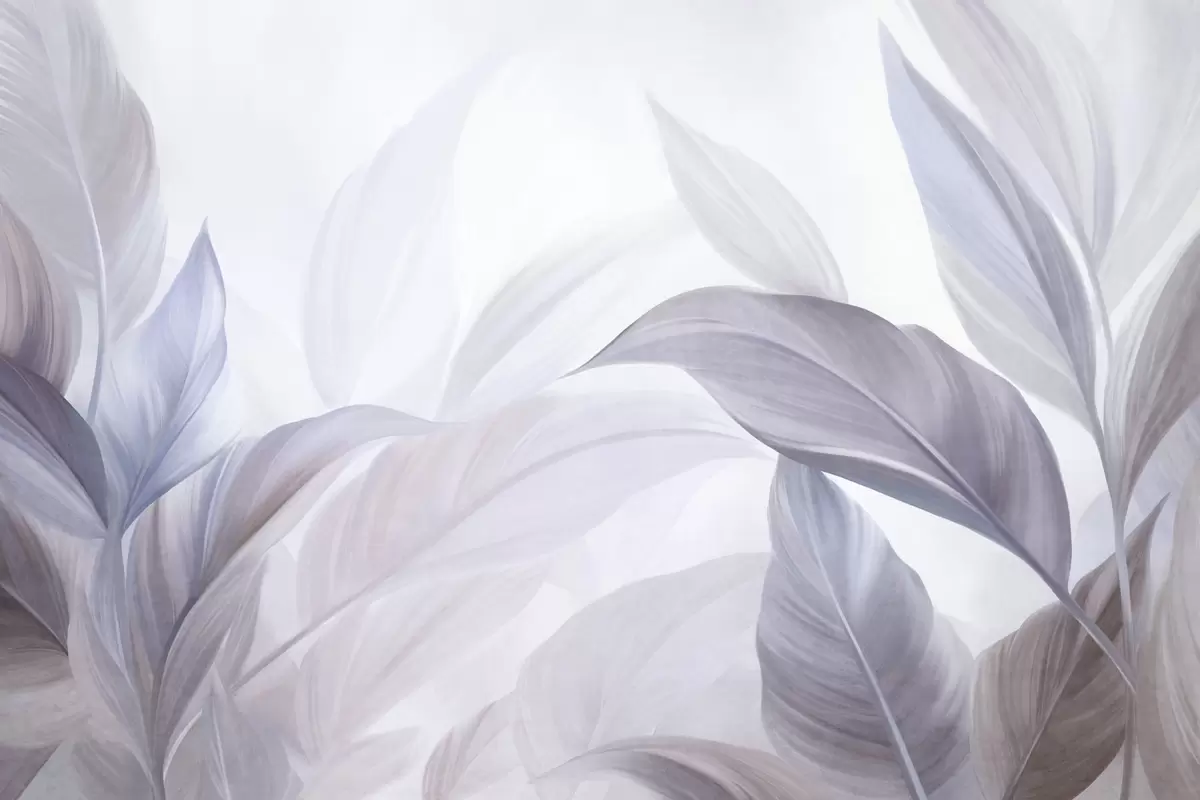 Valokuvatapetti Suuret, vaaleansiniset ja violetit trooppiset lehdet, pehmeillä pastellisävyillä ja teksturoidulla kuvituksella Nr w09816v1