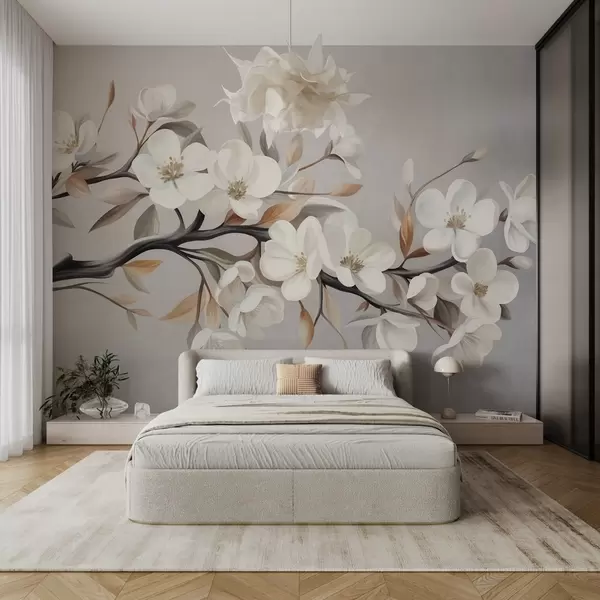 Valokuvatapetti Teksturoitu oksa, jossa on valkoisia kukkia ja ruskeita lehtiä vaaleanharmaalla taustalla Nr w09817