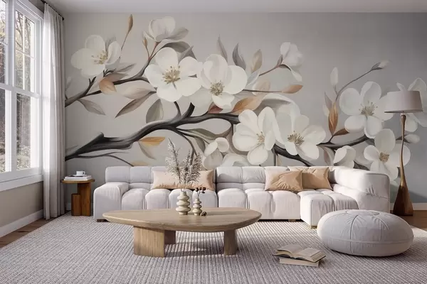 Valokuvatapetti Teksturoitu oksa, jossa on valkoisia kukkia ja ruskeita lehtiä vaaleanharmaalla taustalla Nr w09817