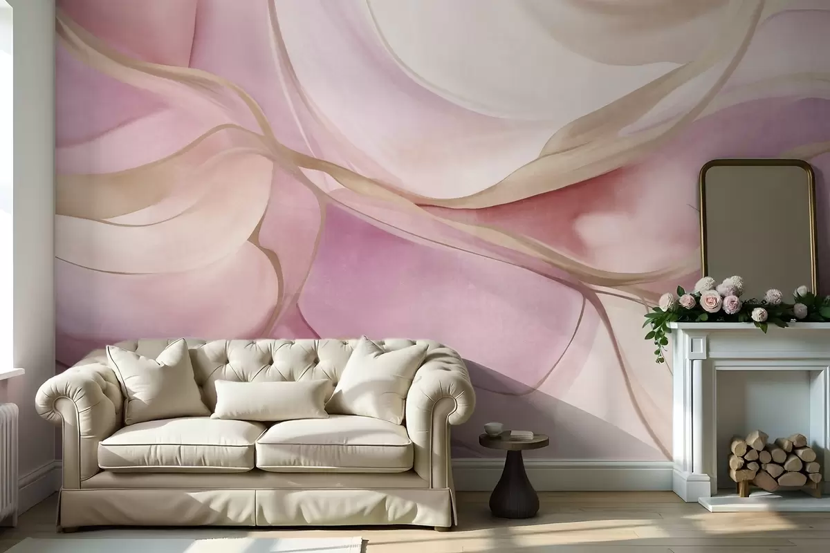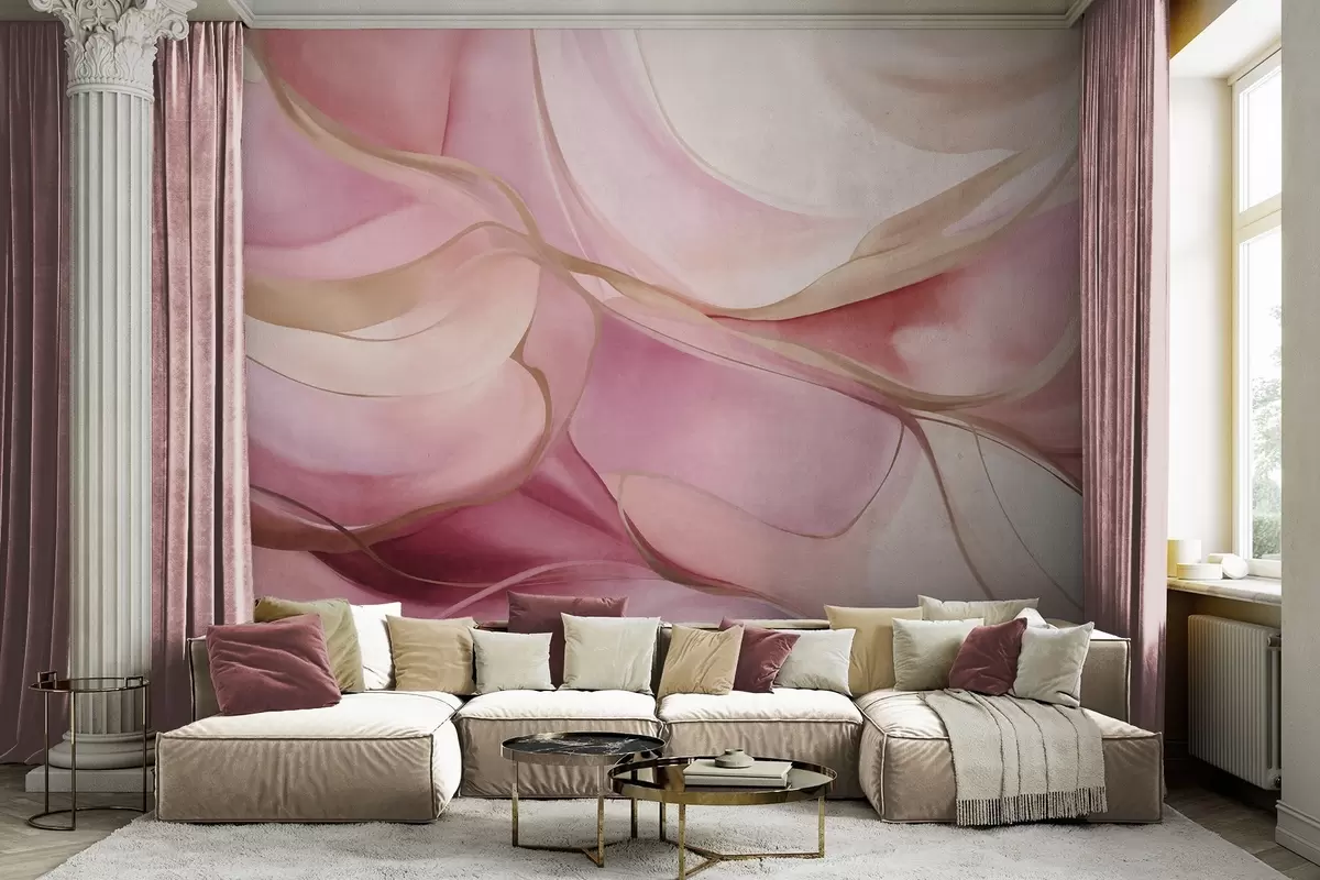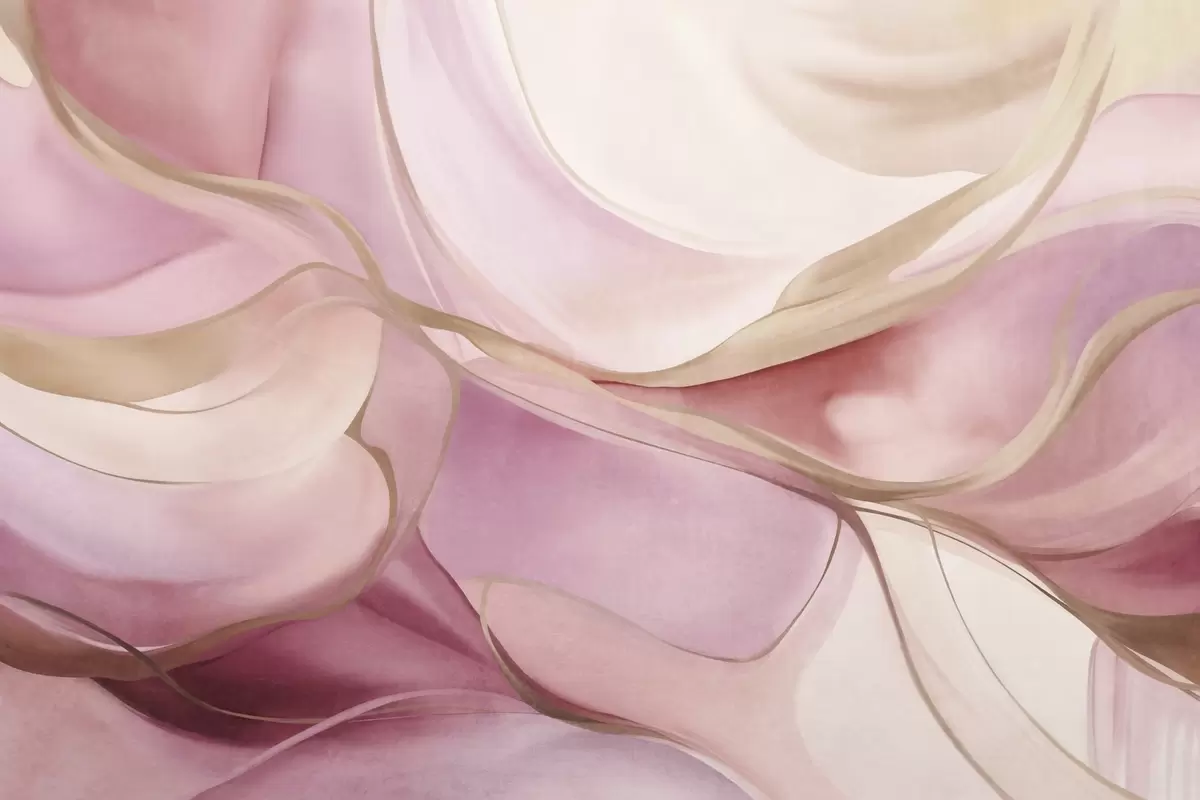 Valokuvatapetti Abstraktit, teksturoidut, virtaavat muodot vaaleanpunaisen ja beigen sävyissä, joissa on hienovaraisia keltaisia viivoja Nr w09818