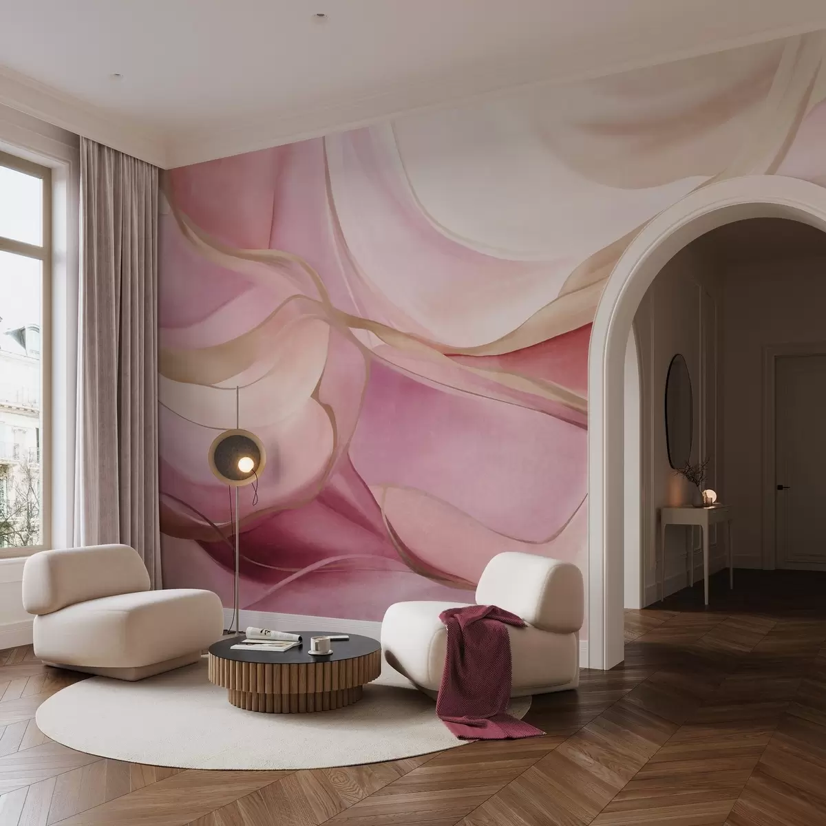Valokuvatapetti Abstraktit, teksturoidut, virtaavat muodot vaaleanpunaisen ja beigen sävyissä, joissa on hienovaraisia keltaisia viivoja Nr w09818