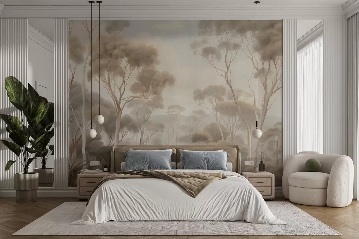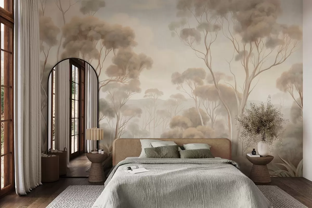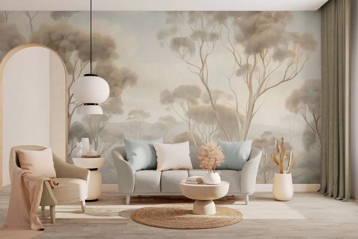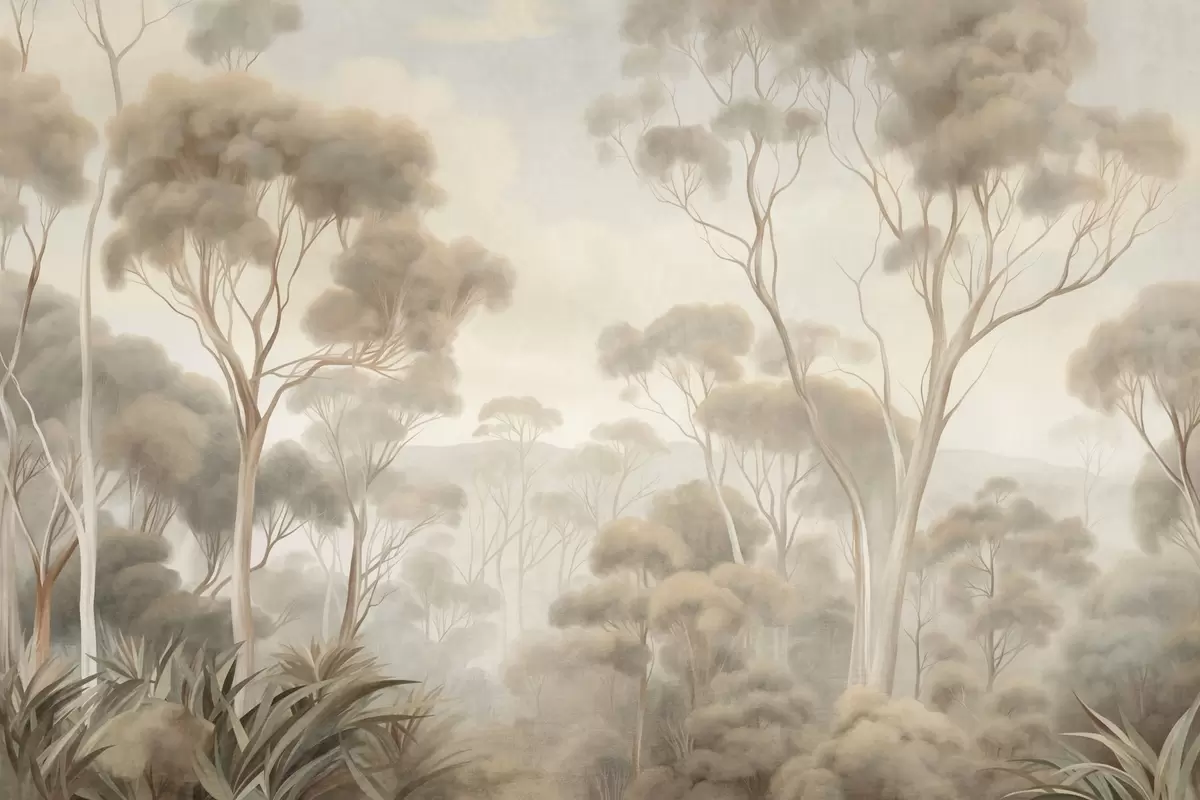 Valokuvatapetti Sumuisen metsän maisema, jossa kohoavat korkeat eukalyptuspuut, kumpuilevat kukkulat pilvisen taivaan alla; teksturoitu taideteos Nr w09822