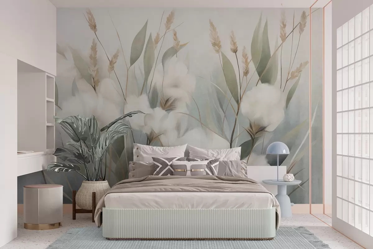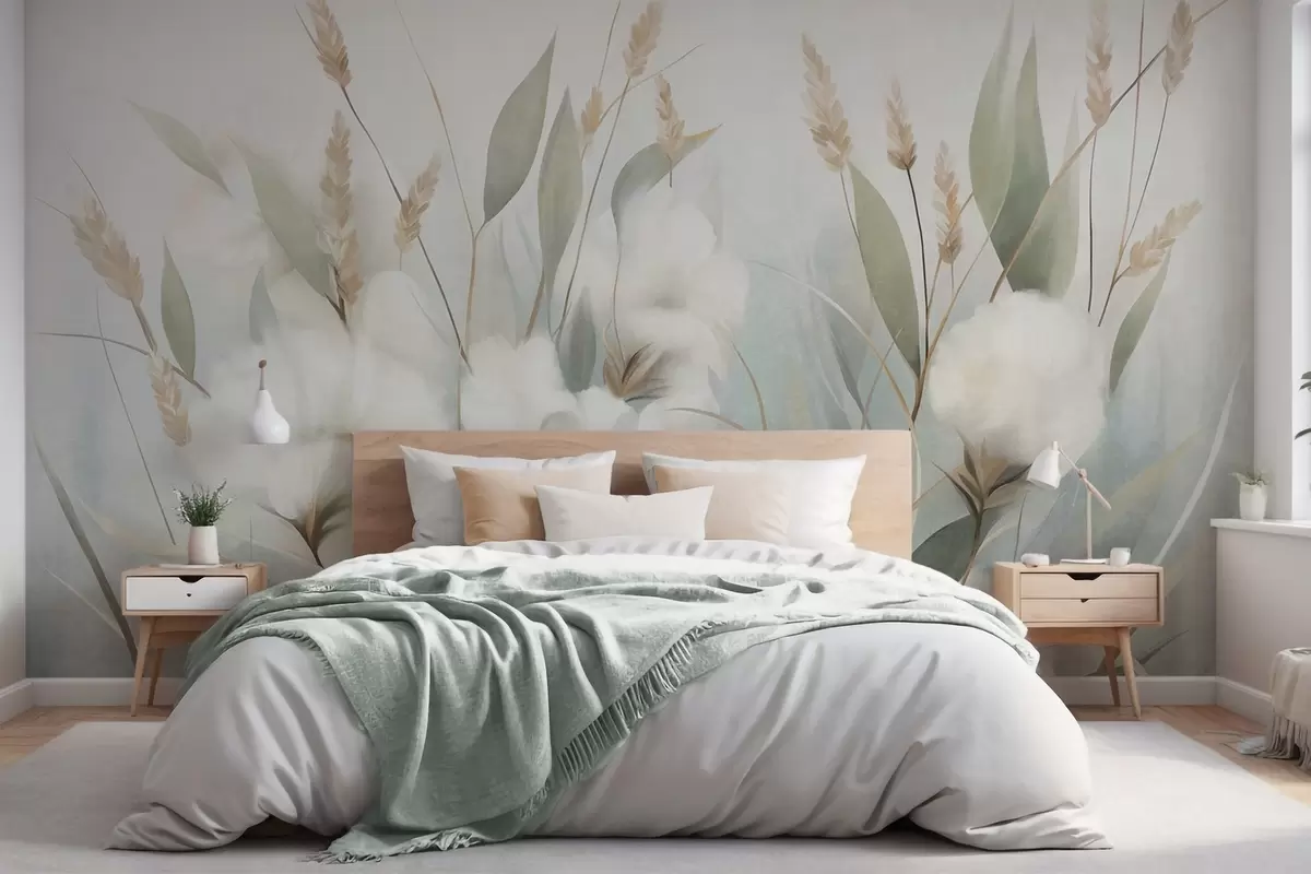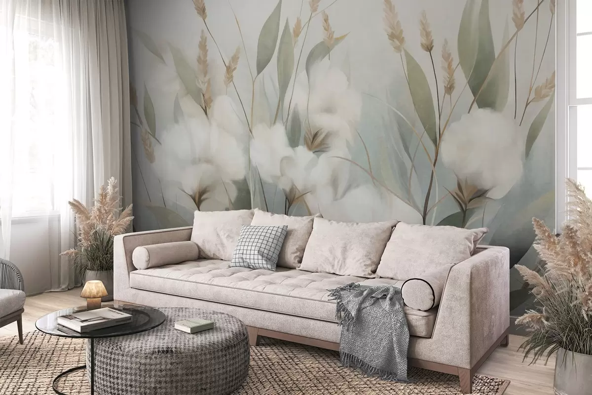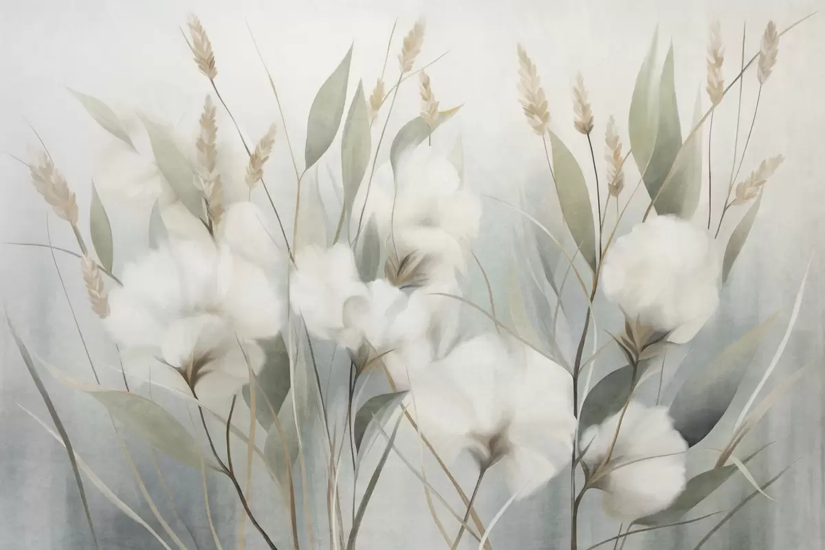 Valokuvatapetti Valkoisia kuivakukkia ja korkeaa ruohoa pehmeällä, hillityllä taustalla, maalattu impressionistisessa tyylissä Nr w09823
