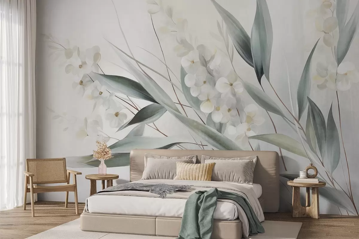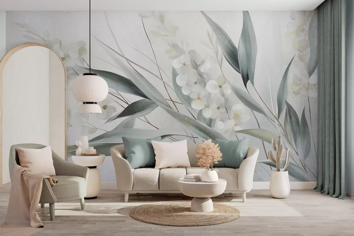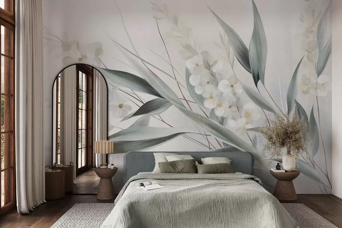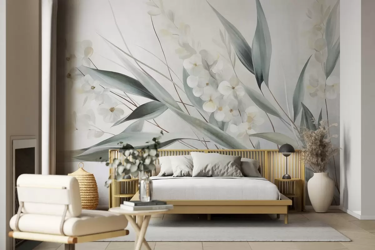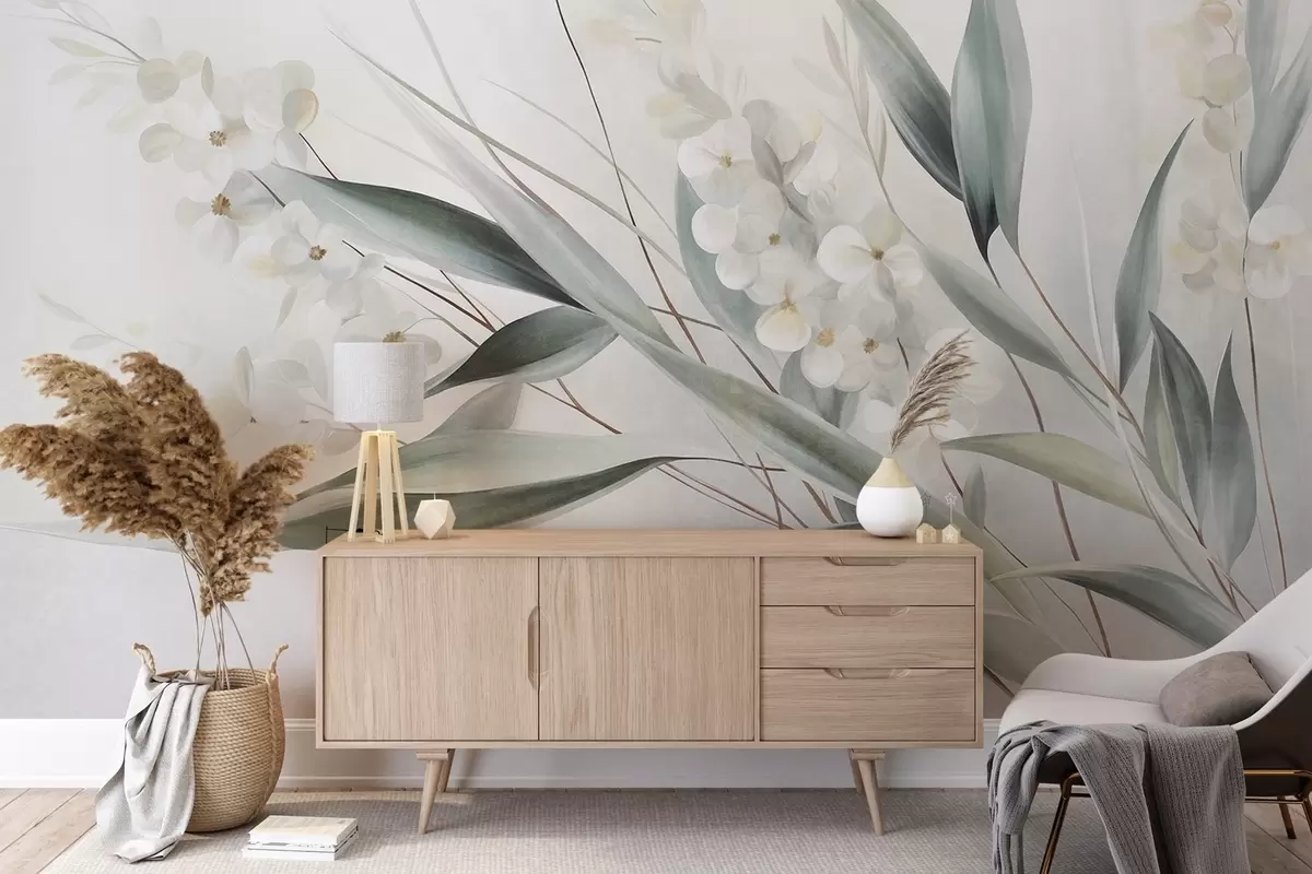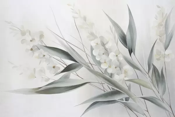 Valokuvatapetti Hienostuneet kukat ja pitkät vihreät lehdet maalauksellisessa tyylissä, jossa on hienovaraisia siveltimenvetoja, tekstuurinen taideteos Nr w09827