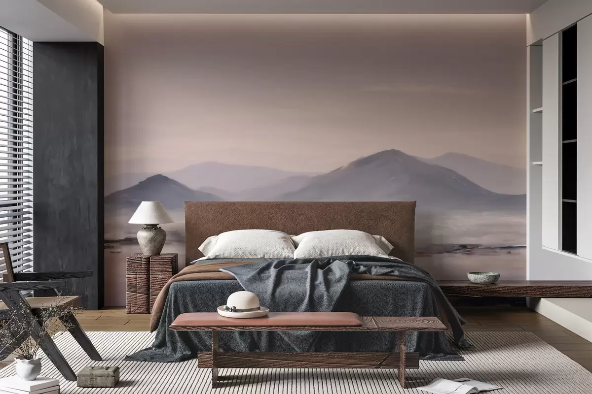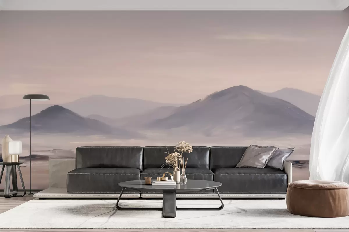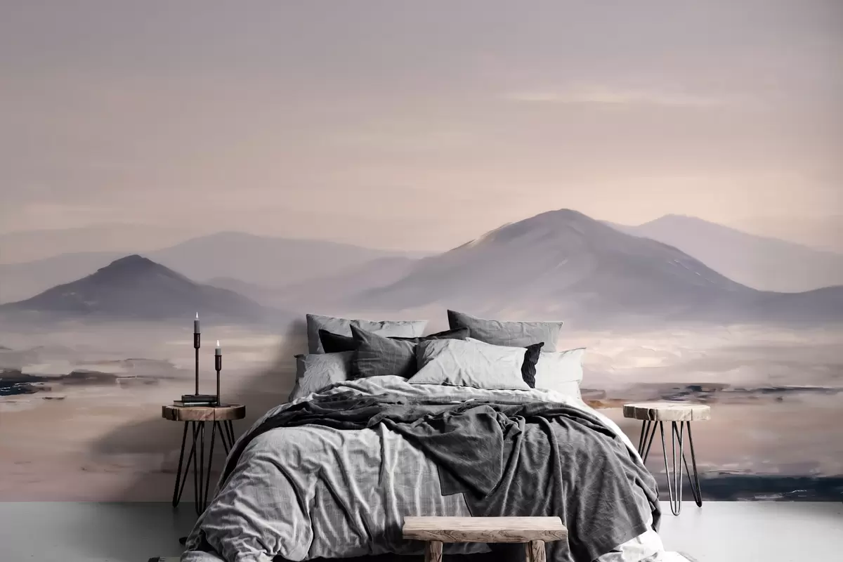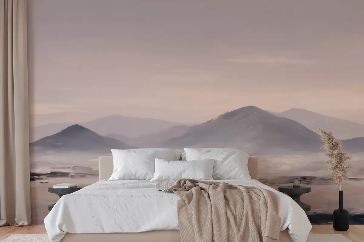 Valokuvatapetti Sumuiset vuoristomaisemat, joissa valon ja ilman väliset siirtymät ovat pehmeitä ja joissa on naamionomainen vaikutelma Nr w09844