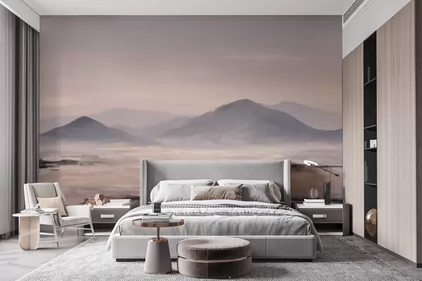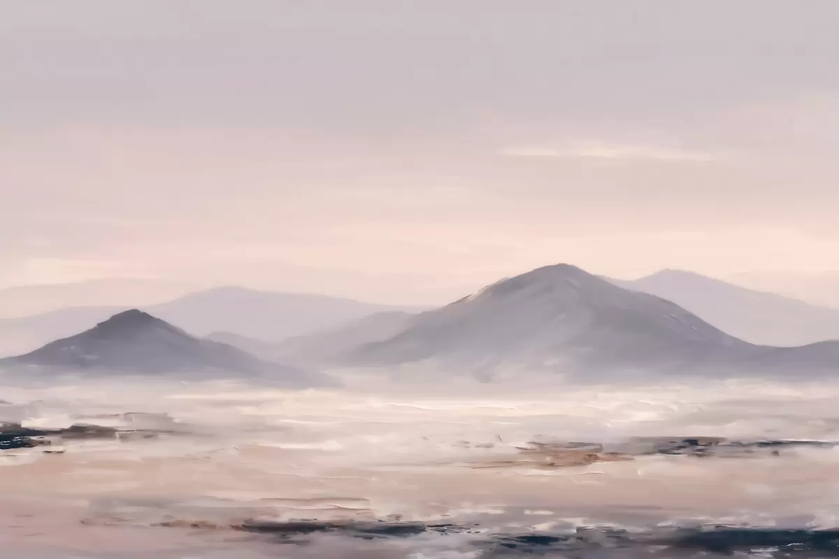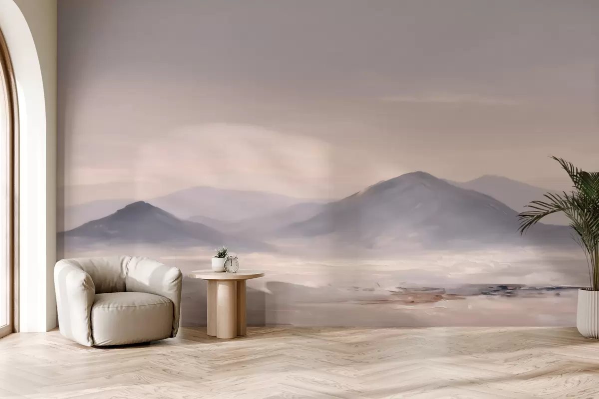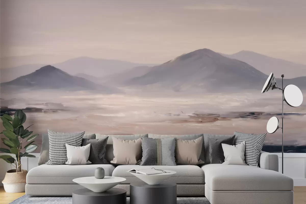 Valokuvatapetti Sumuiset vuoristomaisemat, joissa valon ja ilman väliset siirtymät ovat pehmeitä ja joissa on naamionomainen vaikutelma Nr w09844
