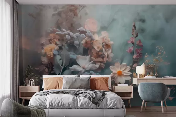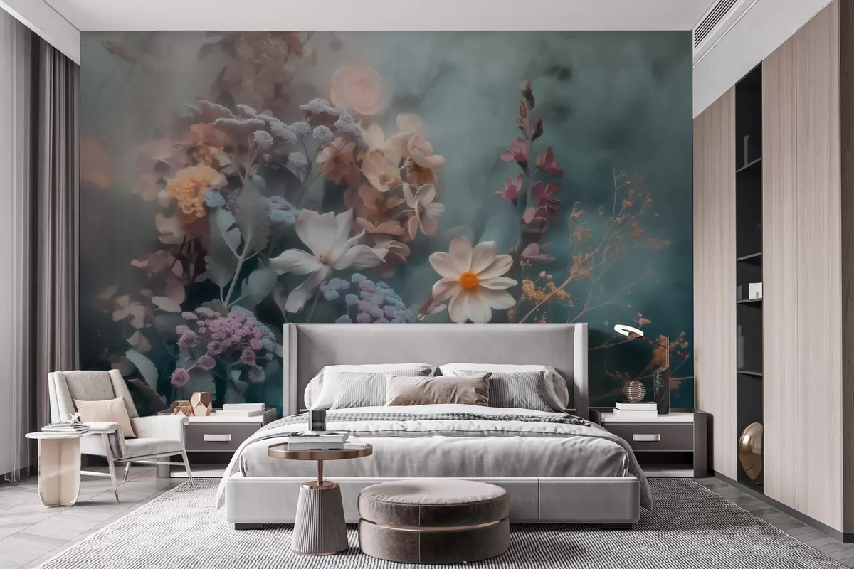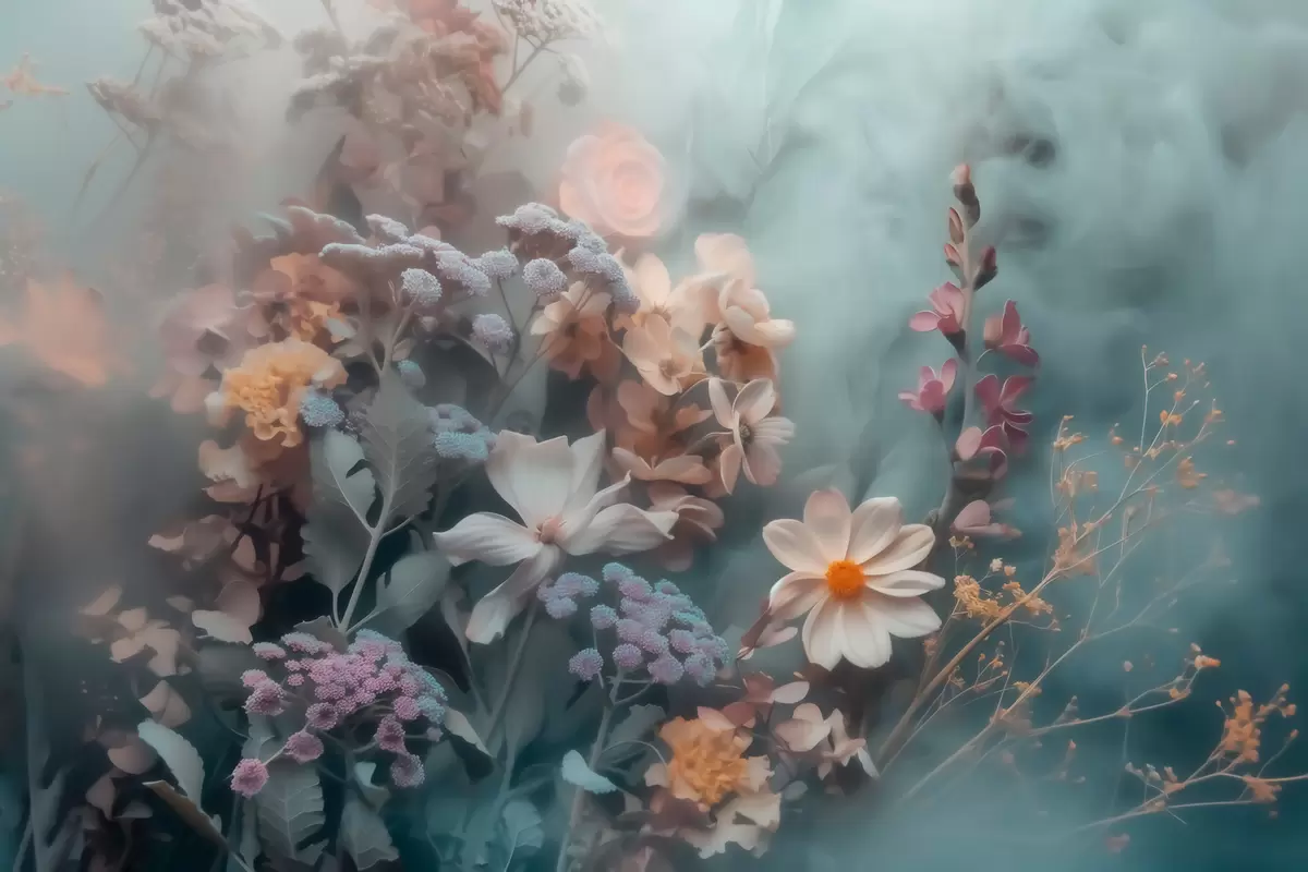 Valokuvatapetti Unelmainen luonnonkukkien sommitelma pastellisävyjen kevyessä hämärässä Nr w09846