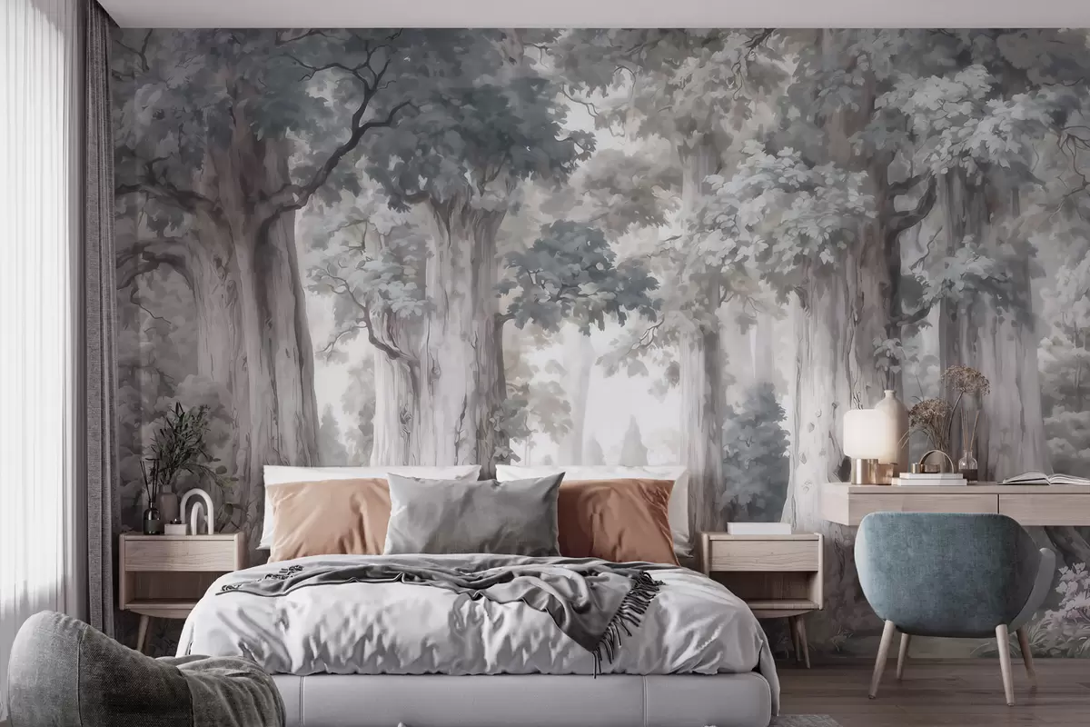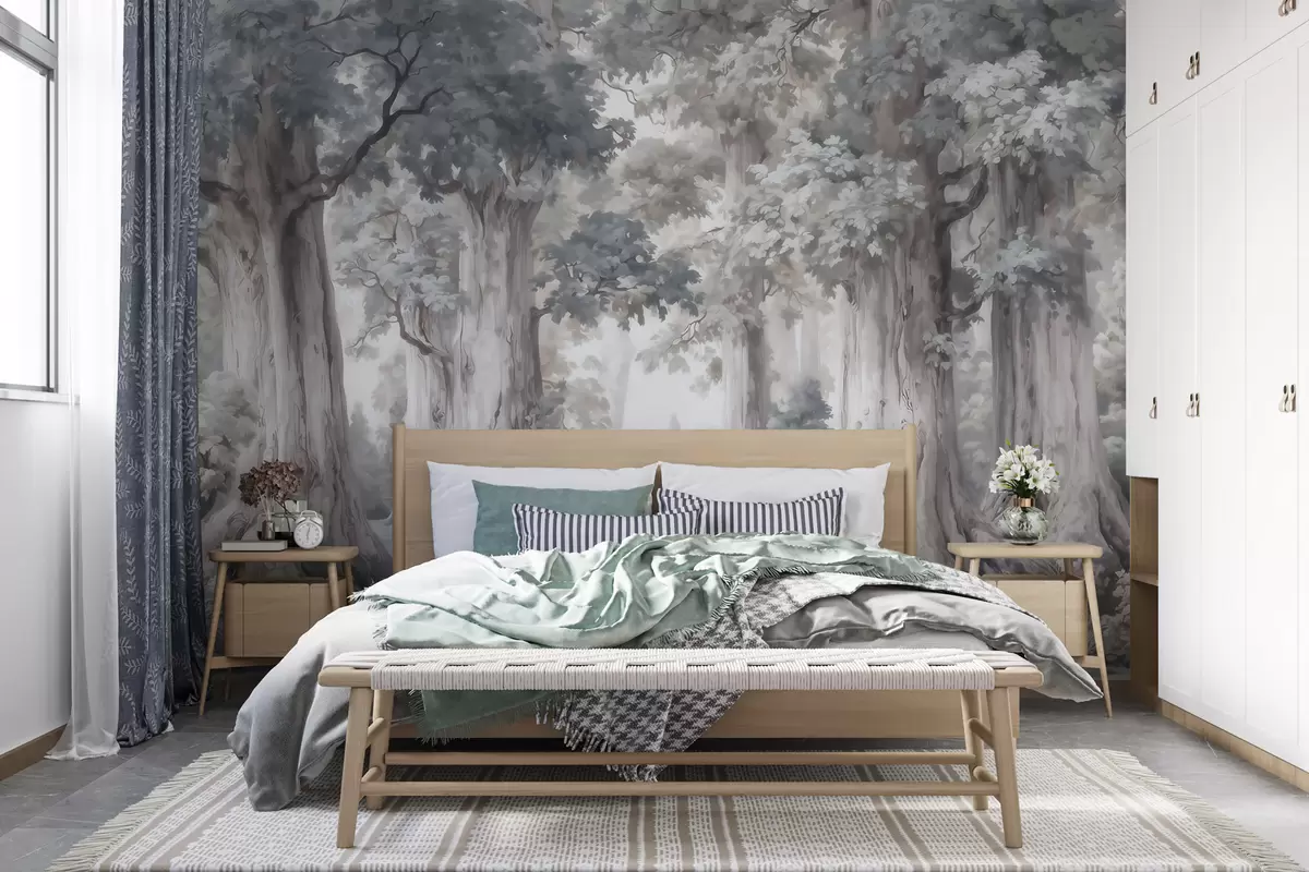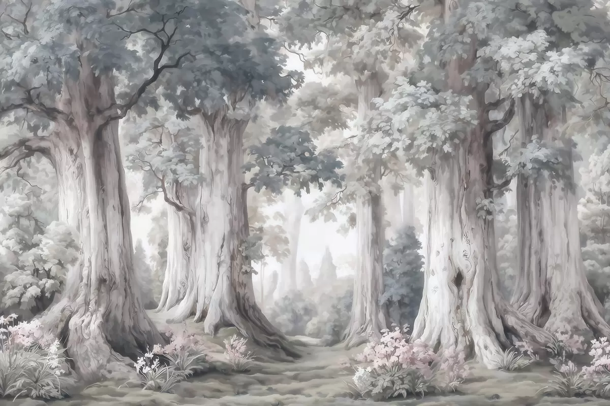Valokuvatapetti Satuinen metsä, jossa on korkeita puita ja pehmeä, hillitty värimaailma vesivärityyliin Nr w09849
