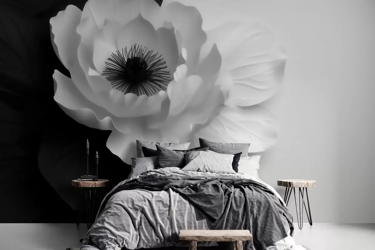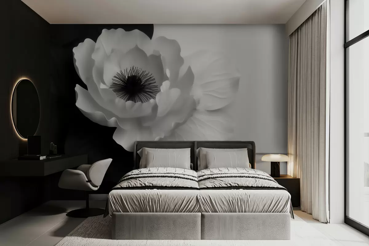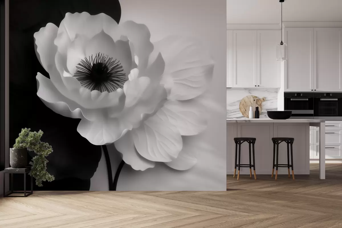 Valokuvatapetti Kontrastinen valkoinen kukka, jonka keskusta on tumma, mustavalkoisella taustalla Nr w09852